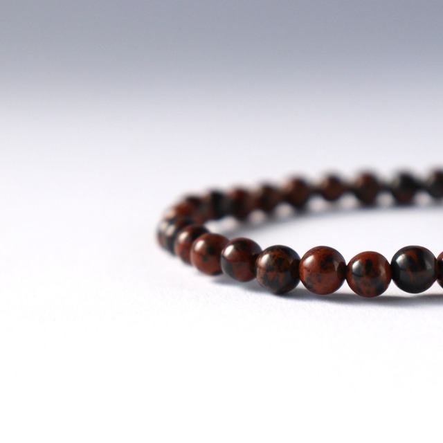 ブラックとブラウンの穏やかな模様が美しい、マホガニーオブシディアンのブレスレット。 オブシディアンは火山活動によって生まれた天然のガラス質の石で、含まれる微細な成分によってさまざまな表情を持ちます。 中でもマホガニーオブシディアンは、赤褐色とブラックカラーがマーブル模様に発色したオブシディアン。鉄分による発色のブラウンが美しいストーンです。 こちらは、ブラウンを基調にブラックが入り込んだ模様のマホガニーオブシディアン。 温かみがありつつ存在感もある、美しい一本です。 ビーズサイズ:約6mm 内径サイズ:約15.5cm 重さ:8.1g