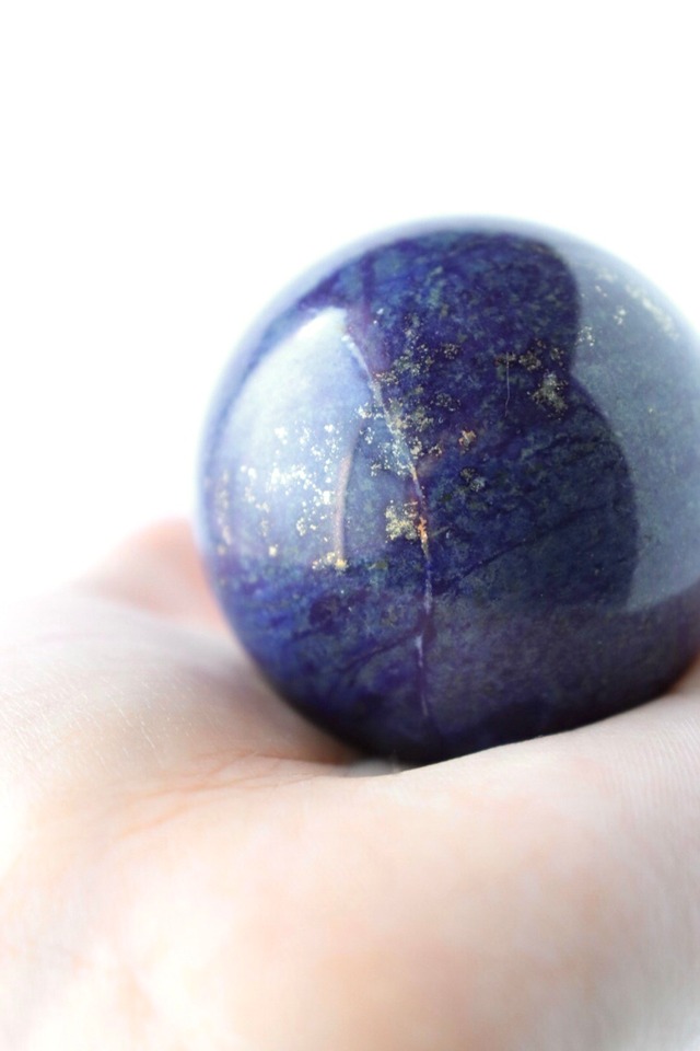 深く濃いブルーと柔らかなブルーが複雑に溶け合ったような、ラピスラズリのスフィア。 パイライトの粒がところどころで金色に輝き、まるで宇宙から見た夜の地球を思わせる幻想的なピースです。 ラピスラズリは、和名を「瑠璃」といい、古くから聖なる石として崇められてきた天然石です。 群青の色はラズライトによるもので、パイライトやカルサイトが混ざることで複雑で深い表情を見せます。 古代エジプトでは護符や装飾品として用いられ、知恵と真実を象徴する石とされてきました。 こちらは、濃いブルーに柔らかなブルーが溶け合い、まるでゴッホの絵画のような奥行きを感じさせるラピスラズリ。 光を受けるたびにパイライトが細やかに輝きます。 UVライトを当てると、オレンジの蛍光も。 静けさの中に壮大な美しさを秘めた、神秘的なラピスラズリのスフィアです。 サイズ:直径4.9cm 重さ:168.9g