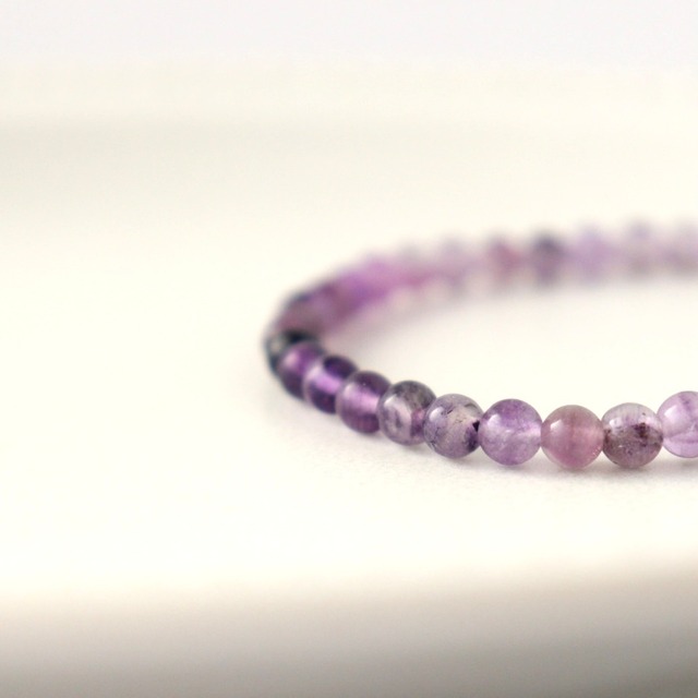 濃いパープルから、ほんのり淡いパープルまで、表情豊かなグラデーションが美しいパープルフローライトのブレスレット。 小粒ながらも、それぞれのビーズが異なるニュアンスを持ち、しっとりとした落ち着きがあります。 フローライトは和名を「蛍石」と呼ぶ蛍光性質をもつ天然石。 様々なカラーバリエーションをもち、ブルーやグリーン、パープルやカラーレスまで幅広いカラーで人気のストーンです。 中でもパープルフローライトは第六感や霊性に関わるとされ、瞑想やインスピレーション向上におすすめの石でもあります。 こちらは、透明感のあるビーズを中心に濃淡様々なパープルが揃ったフローライトのブレスレット。 淡く色づいた透明感のある結晶から、アメジストを思わせる深みのあるパープルまでが自然に連なり、光を受けると内側から柔らかく発色します。派手さはありませんが、静かな余韻を感じさせる佇まいです。 ビーズサイズ : 約5mm 内径サイズ:約15.5cm 重さ:6.3g