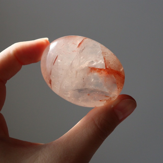 水の中をイメージさせるような透明感の、レッドヘマタイトインクォーツの握り石。 見つめていると時間を忘れてしまうような結晶の輝きをもつひとつです。 ヘマタイトインクォーツは、水晶の中に染み込んだヘマタイトが発色することで、奥行きや繊細な色みを感じさせる不思議な天然石。 こちらのピースは、透明度が高いクォーツにヘマタイトが大きく入り込んだレッドヘマタイトインクォーツ。 キラキラと至る所に入り込む虹や白いモヤのようなインクルージョンも大変美しいです。 手に取ってみると、とても滑らかで温かみのある感触があります。 光を通すたび、金魚が泳ぐ水面を覗き込んで見ているような、瑞々しい美しさを味わうことのできるピースです。 サイズ:5.2×3.9×2.2cm 重さ:69.5g