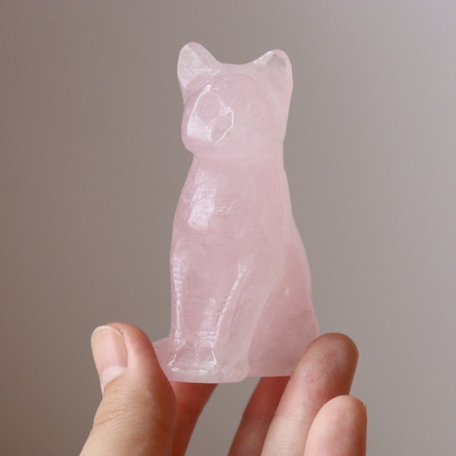 柔らかなピンクカラーを湛えたローズクォーツのきつね。 優しいピンクと存在感のある立ち姿が印象的です。 ローズクォーツは、ピンクカラーに色づいた水晶。 愛と美を象徴する石とされ、古代エジプトでは美容や装飾に使用されていました。 10月の誕生石でもあります。 こちらは、透明のあるローズクォーツが神秘的なきつねの姿にカービングされています。 足を揃えてすっと座る姿が大変美しいです。 発色の良いローズクォーツの結晶と、シュッとしたシルエットが美しいピース。 きつねは古くより神の使いとして考えられてきた存在です。 尻尾が稲穂に似ていることから豊穣を司る稲荷神社と縁が深いとされ縁起の良い動物とされています。 美を司るにふさわしい佇まいと守神のような優しい眼差しのきつねです。 サイズ:6.1×4.0×2.5cm 重さ:58.9g