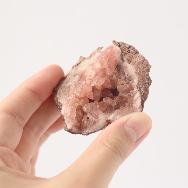 やわらかなローズピンクの結晶が可愛らしい、ピンクアメジストの原石クラスター。 ピンクアメジストは近年新しく発見されたピンクカラーのアメジストで、アメジストにヘマタイトなどが含まれることで自然にピンクに発色した天然石。 ピンクカラーの水晶ではありますが、ローズクォーツとは違った発色なのだそうで、透明感を保ちながらも深みのある優しい色合いから、近年人気が高まっています。 こちらは、ほんのりとピンクを帯びた母岩から、半円状にジオードをなすようにローズピンクの結晶が育ったクラスター。 結晶全体が柔らかなローズピンクに発色しており、ローズクォーツでもアメジストでもない不思議な色合いに惹き込まれます。 母岩と結晶が調和する姿は大変美しく、コレクションピースとしてもおすすめの標本です。 希少で可愛らしいピンクのアメジストを、原石クラスターでお楽しみください。 サイズ:5.5×4.5×3.3cm 重さ:65.9g
