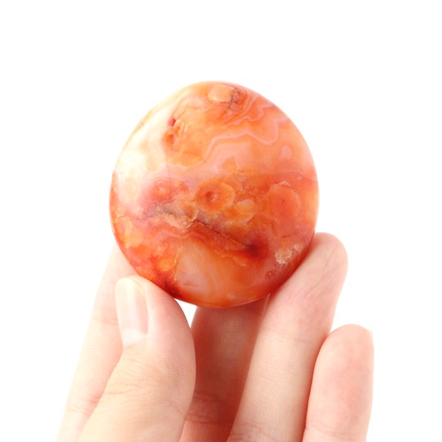 やわらかなオレンジレッドカラーのレッドアゲート。 手に馴染む形の良い握り石です。 レッドアゲートは和名を赤瑪瑙という美しい縞模様をもつ天然石で、その美しい模様から装飾品や芸術品としても扱われていました。 日本やチベットではお守りや魔除けとして使用された歴史も存在します。 こちらは、明るいオレンジのレッドアゲート。 アゲートらしい縞模様は控えめで、じわじわとやわらかく広がったようなカラーリングが珍しい握り石です。 レッドアゲートの石の持つ明るいエネルギーを、握りやすいフォルムでお楽しみください。 サイズ:5.6×4.7×2.6cm 重さ:87.1g