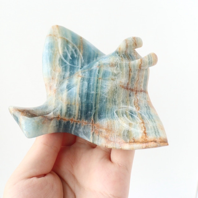 爽やかなスカイブルーの縞模様が美しいブルーオニキスのマンタ。 両ヒレを大きく広げて自由に泳ぐ姿は、広大な海の広がりそのものを映し出しているかのようです。 にっこりと微笑んだ表情が心を和ませてくれます。 ブルーオニキスの名で流通するこの石は実際にはレムリアンアクアティンカルサイトと呼ばれるカルサイトの一種で、深みのあるスカイブルーと大地を思わせるブラウンの縞模様が特徴です。 その色合いは、空と海、大地をつなぐような雄大な調和を感じさせてくれます。 こちらは、ヒレを大きく広げ海を自由に泳ぐ姿に磨かれた、ブルーオニキスのマンタ。 深みのあるブルーとブラウンの美しい縞模様がさざ波のようです。 にっこりとおだやかに微笑む表情もキュート。 心を癒してくれるブルーカルサイトのマンタをお楽しみください。 サイズ:12.2×10.0×3.0cm 重さ:255.3g