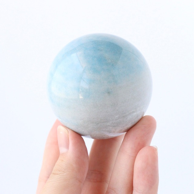 涼しげな水色が印象的な、ブルーカルサイトのスフィア。 夏の空や穏やかな海を思わせるような、柔らかで優しい色合いが心を和ませてくれます。 カルサイトは和名を「方解石」といい、非常に多くの色と形状で産出される鉱物で、中でもブルーカルサイトは希少性が高く、淡い水色の結晶は人気です。 古代では視野を広げる石として扱われ、洞察力や冷静さを保つお守りとして重宝されていた記録も残っています。 こちらは、ブルーカルサイトの中でも色の濃淡が美しく、結晶の深みが感じられる高品質なスフィア。 球体形状に磨かれ、ひんやりとした感触とつるりとした質感が心地よいです。 表面に石目による若干の凹みはありますが、角度によって美しいシラーや虹が現れる箇所も。 手のひらの中で、そっと穏やかな時間をもたらしてくれるような、美しいブルーカルサイトをお楽しみください。 サイズ:直径5.3cm 重さ:214.8g