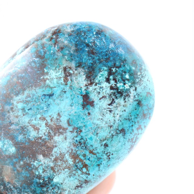 自然の中で生まれた不思議なブルーが美しい、 レアストーン、シャッタカイトの握り石。 不規則に広がるブラウンと鮮やかなブルーに惹き込まれます。 シャッタカイトは鮮やかなブルーグリーンに 独特の模様をなすことで知られるストーン。 最初に発見されたアメリカアリゾナ州の シャッタク鉱山にちなんで名付けられました。 クリソコラとよくにていますが、 クリソコラは銅を含む鉱物が風化し 粘土状になったもの、 シャッタカイトは銅の二次鉱物(分解した鉱物が再生成したもの)を指します。 こちらは鮮やかなブルーの発色が美しい シャッタカイトの握り石。 濃いブルーと鮮やかなスカイブルーの間に ブラウンカラーが木の根のように広がっています。 自然が生み出した不思議なブルーのグラデーションは、地球のような存在感。 お守りとしてもおすすめのピースです。 サイズ:4.7×3.7×1.4cm 重さ:50.0g