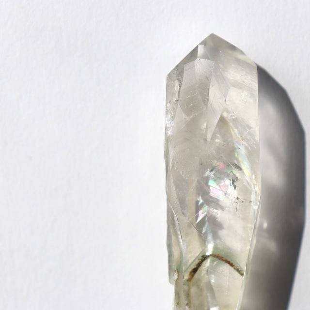 ブラジル・ミナスジェライス州コリント産のクロライトインクォーツ原石ポイント。 現地ブラジル・コリントより直接迎えました。 ポイント形状を保ちながらファセット面などを丁寧に研磨したセミポリッシュ仕上げで、結晶内にはガーデンクォーツとしての風景が広がります。 クリアクォーツ(水晶)は世界各地で産出され、産地ごとに表情が異なる天然石。クローライトインやファントムなどの内包を持つタイプはコレクターからも人気が高く、自然が生み出した一点ものの魅力を楽しめます。 お部屋に置いて空間を整える石として、またお守りのように身近に置いていただくこともおすすめです。 こちらはほんのりイエローに発色した不思議な魅力のダブルポイント。正面は磨かれ、驚くほどクリアな結晶の奥行きを堪能できます。 下部にはイエローのヘマタイトと思われるインクルージョンが入り、全体にやわらかな黄金色のニュアンスを帯びています。 ほかの結晶が接していた面には幾重にも重なる虹が現れ、成長時の神秘的な模様とともに、いつまでも眺めていたくなるひとつです。 サイズ:6.3×2.2×1.2cm 重さ:24.9g