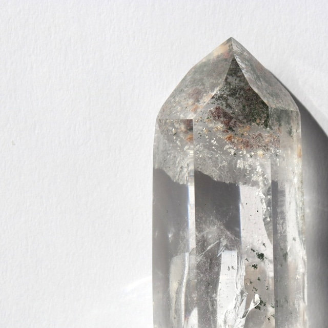 ブラジル・ミナスジェライス州コリント産のクロライトインクォーツ原石ポイント。 非常に透明度の高い結晶に、クローライト(緑泥石)が内包されたクリアクォーツです。 現地ブラジル・コリントより直接迎えました。 ポイント形状を保ちながらファセット面などを丁寧に研磨したセミポリッシュ仕上げで、結晶内にはガーデンクォーツとしての風景が広がります。 クリアクォーツ(水晶)は世界各地で産出され、産地ごとに表情が異なる天然石。クローライトインやファントムなどの内包を持つタイプはコレクターからも人気が高く、自然が生み出した一点ものの魅力を楽しめます。 お部屋に置いて空間を整える石として、またお守りのように身近に置いていただくこともおすすめです。 こちらはガーデンクオーツとしての要素も豊かなダブルポイント。内部には美しい表情のクローライトとグリーンファントムを宿しています。 ファントムとは、水晶が一度成長を止め、再び結晶する過程で山型の層として刻まれる成長の痕跡のこと。 さらに根元や中央付近には、一度折れて再結晶したかのような跡が見られ、力強い成長の物語を感じさせます。驚くほどの透明度と自然のドラマをあわせ持つ、芸術作品のようなピースです。 サイズ:7.5×2.0×1.5cm 重さ:33.9g