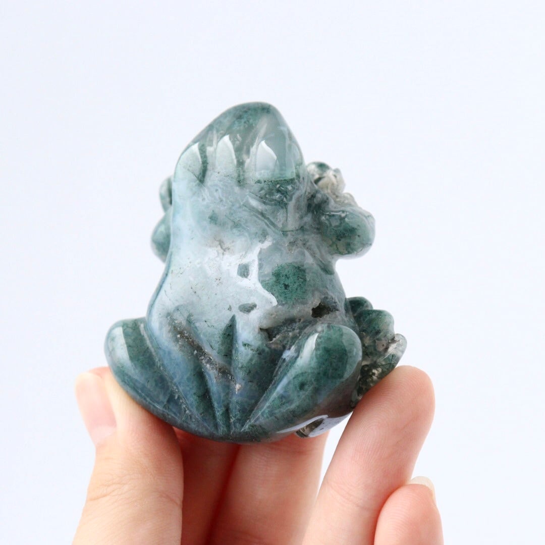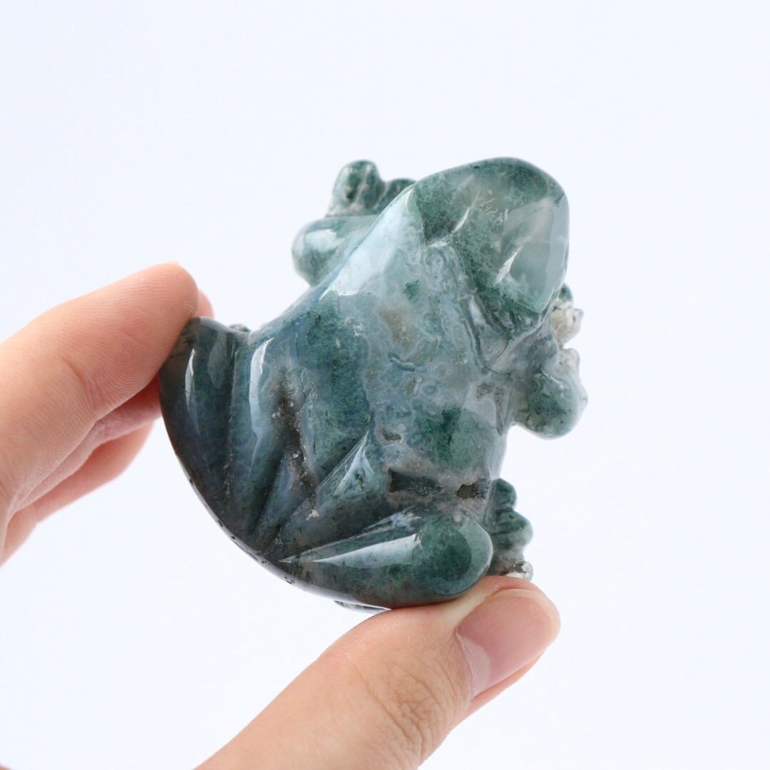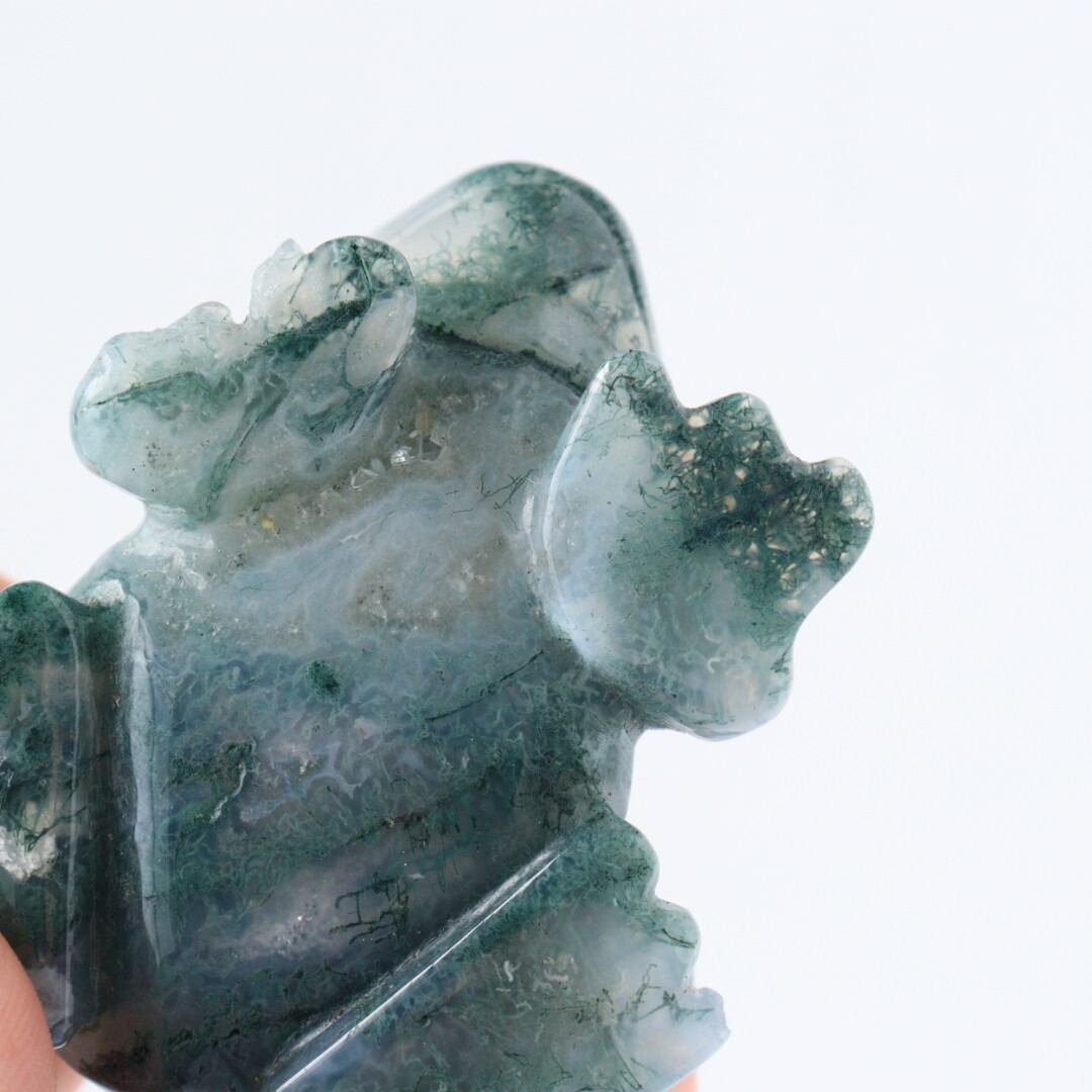苔むしたようなグリーンと半透明の結晶が混ざり合う、美しいモスアゲートのカエル。
