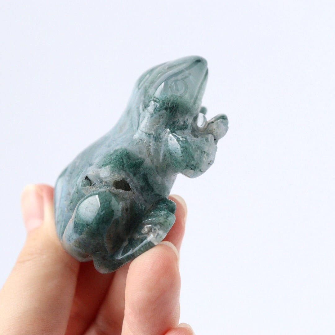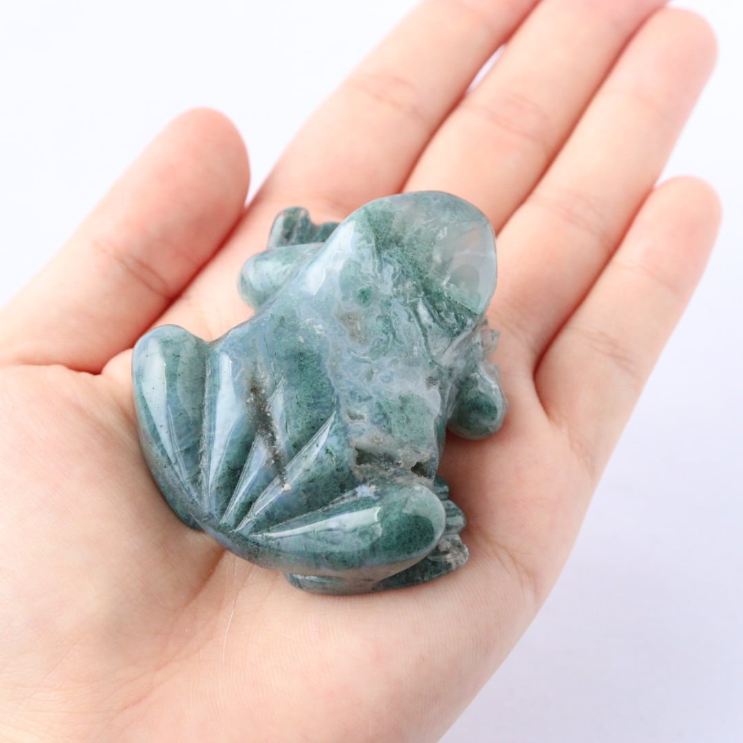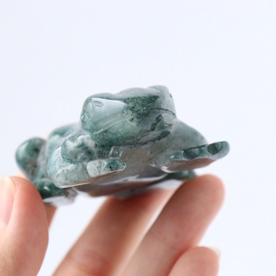 苔むしたようなグリーンと半透明の結晶が混ざり合う、美しいモスアゲートのカエル。
