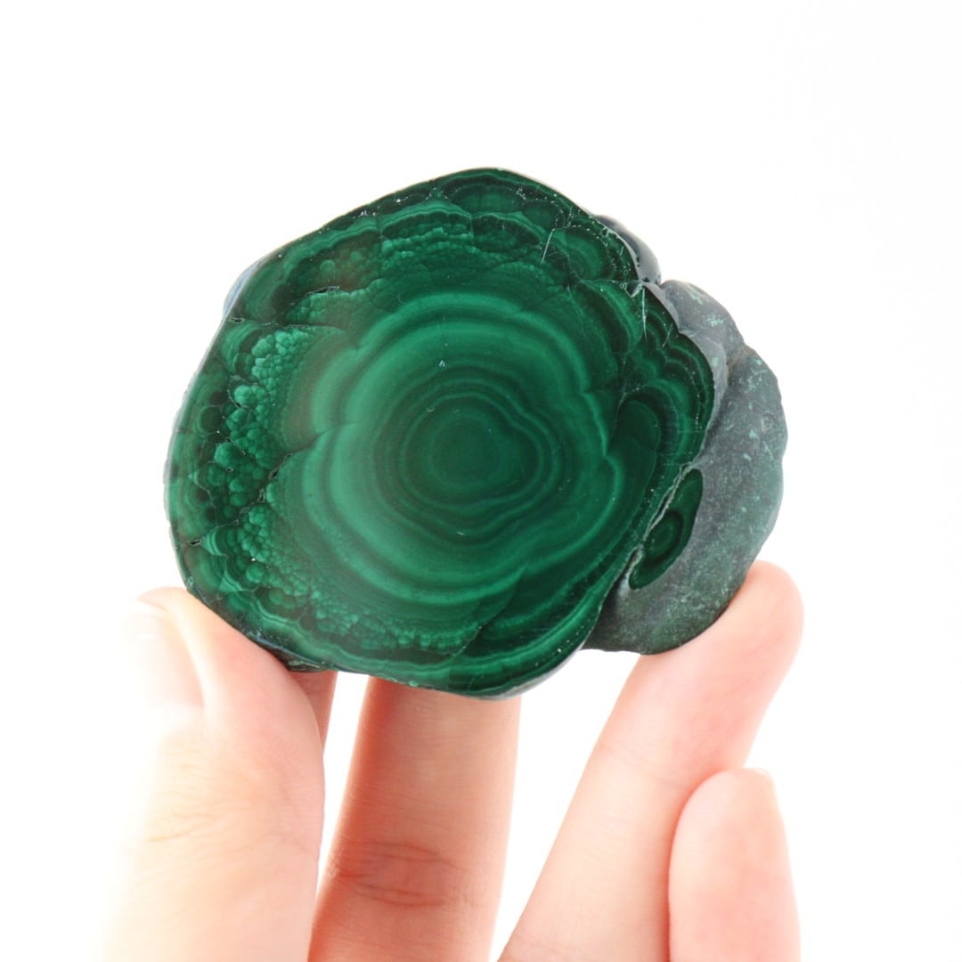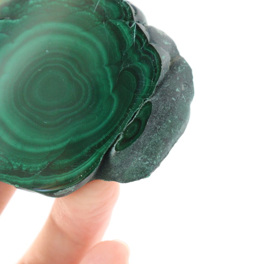 こちらは、深いグリーンの発色と見事な縞模様をもつマラカイトの原石。