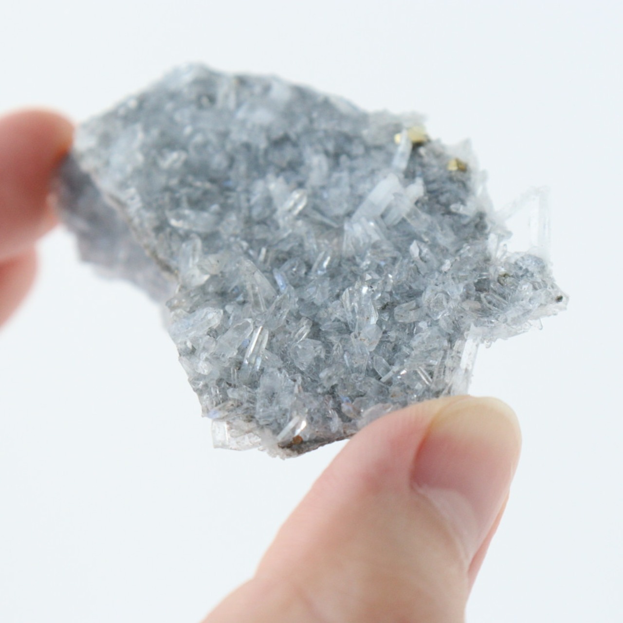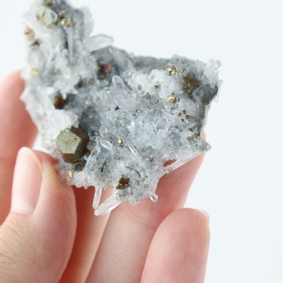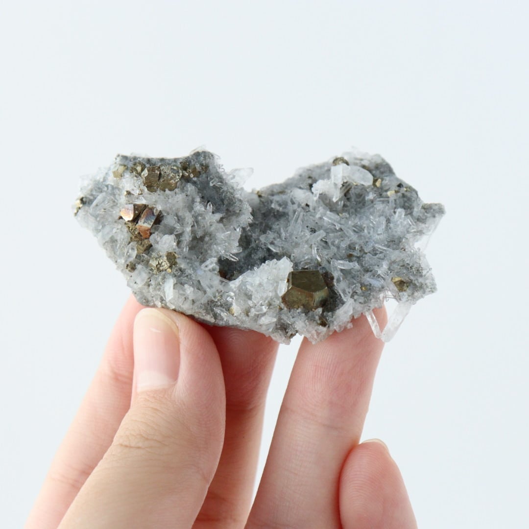 こちらは、細やかで透明感のある水晶と、金属光沢のあるパイライトの結晶が共生した原石クラスター。鉱物としての結晶の形がはっきりと現れる部分の違いが、不思議で魅力的です。