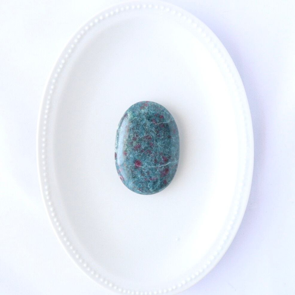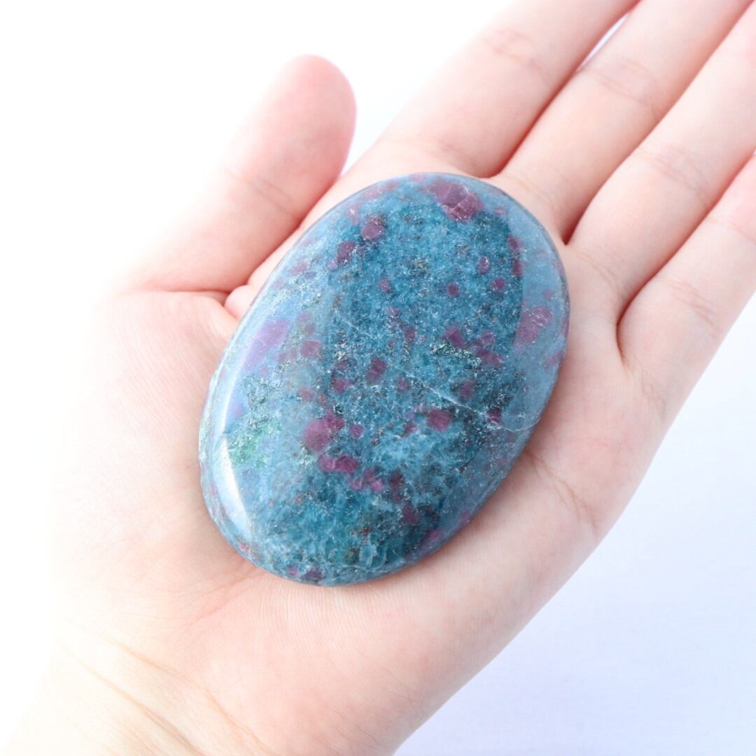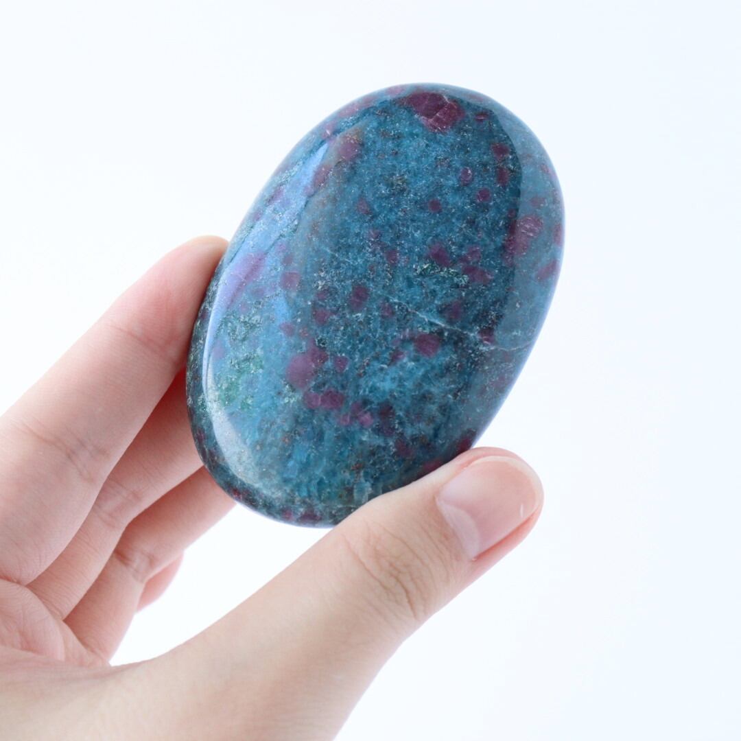 こちらは、深く落ち着いたブルーに鮮やかなピンクカラーのルビーがインクルージョンした、ルビーインカイヤナイトの握り石。