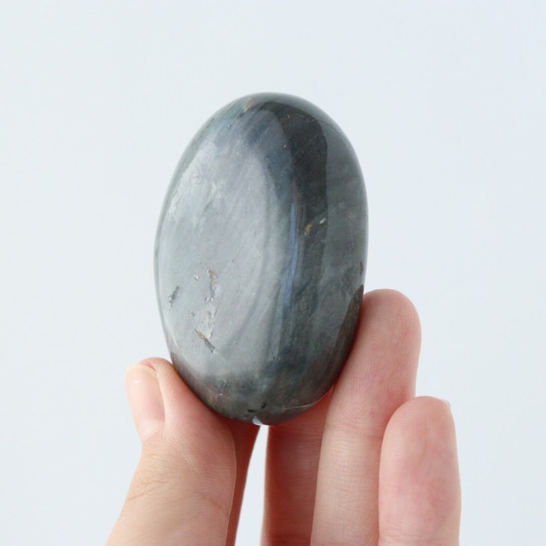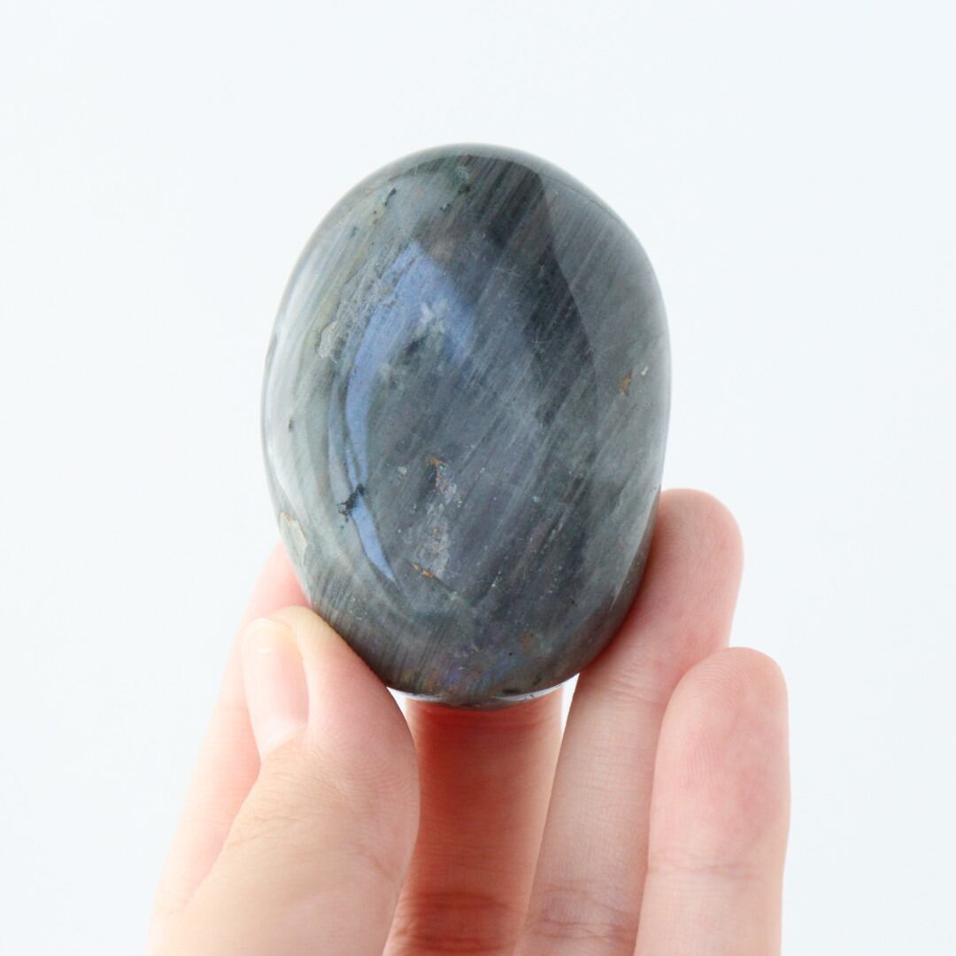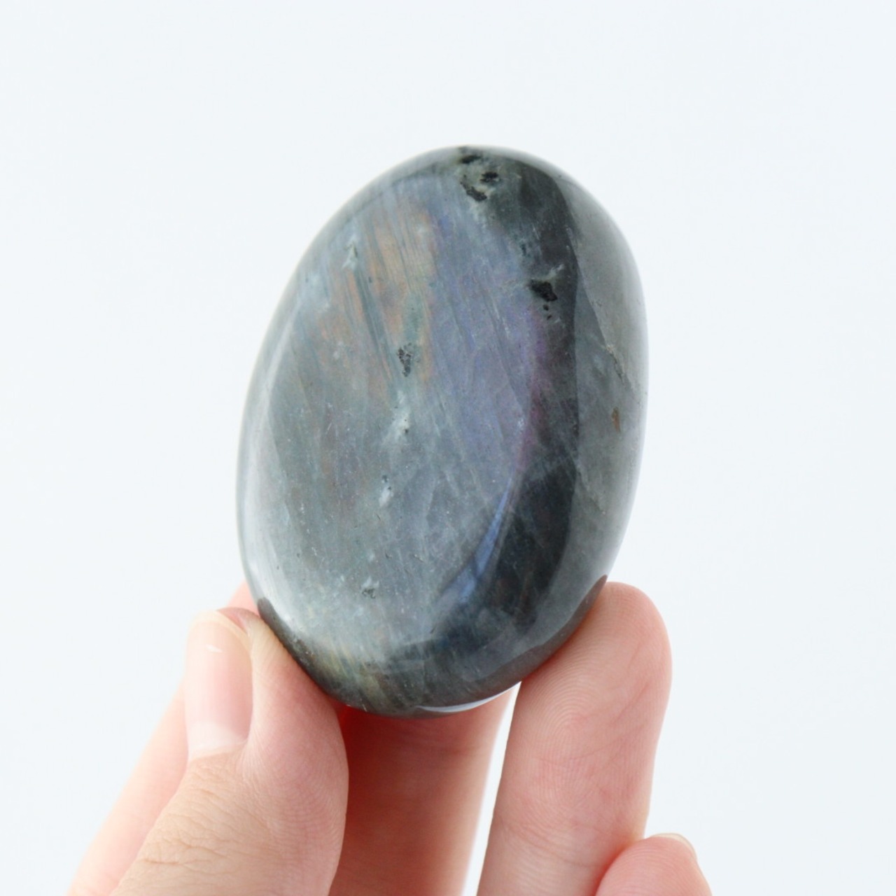 パープルやイエローの美しいシラーが浮かび上がる、ラブラドライトの握り石。