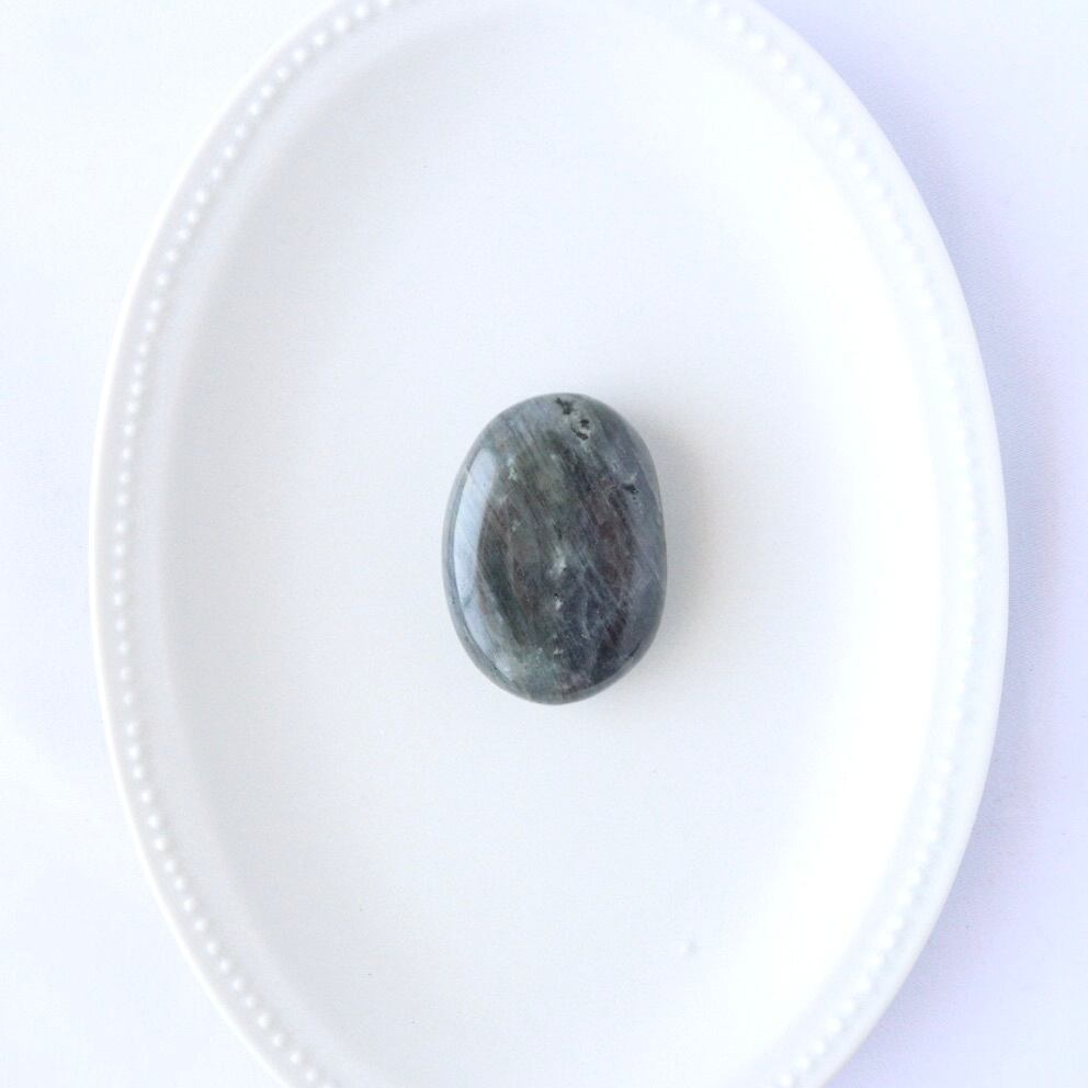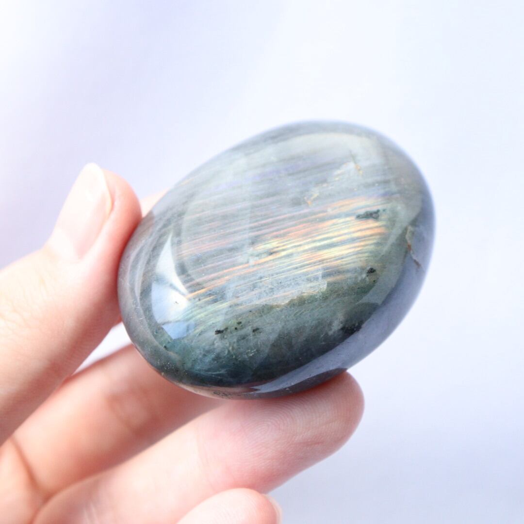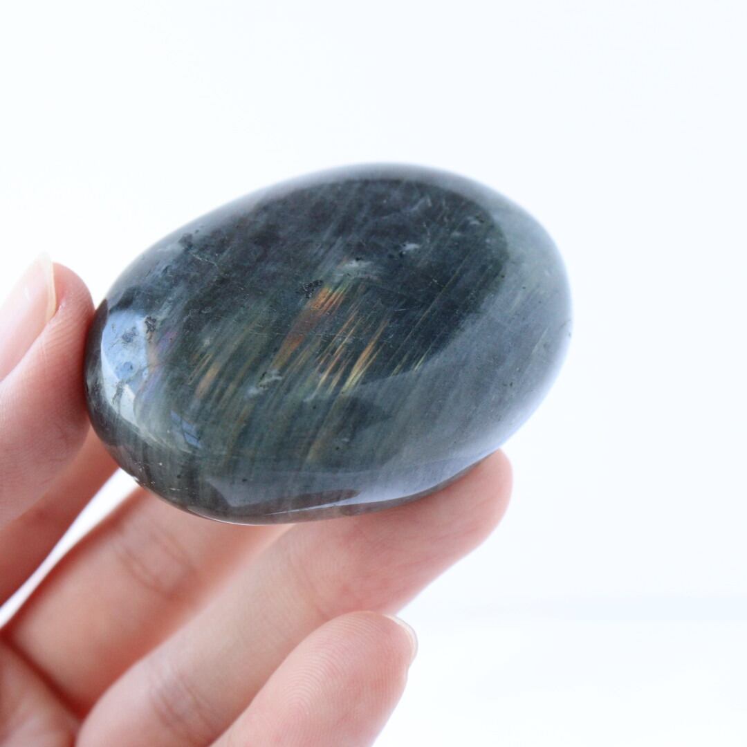 パープルやイエローの美しいシラーが浮かび上がる、ラブラドライトの握り石。