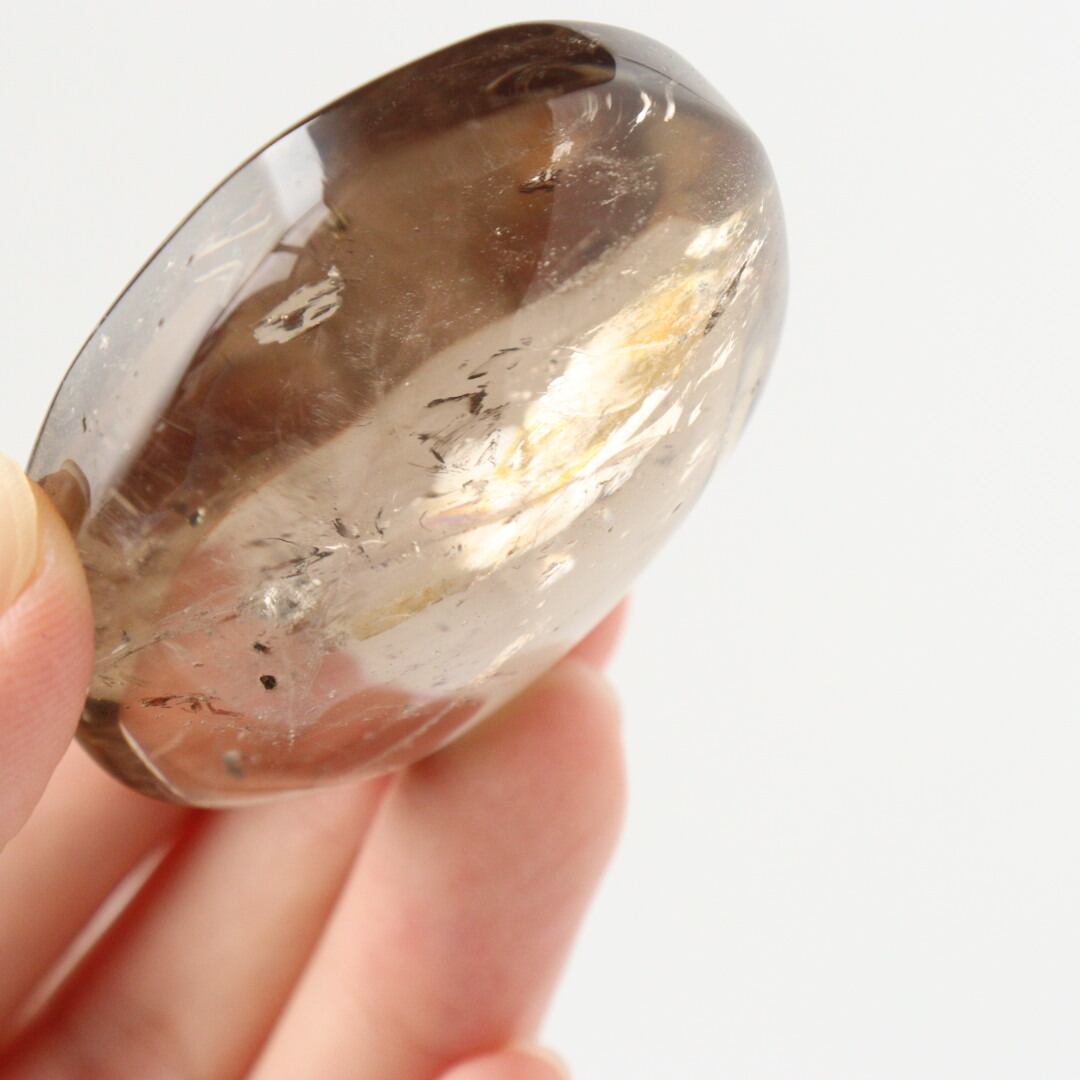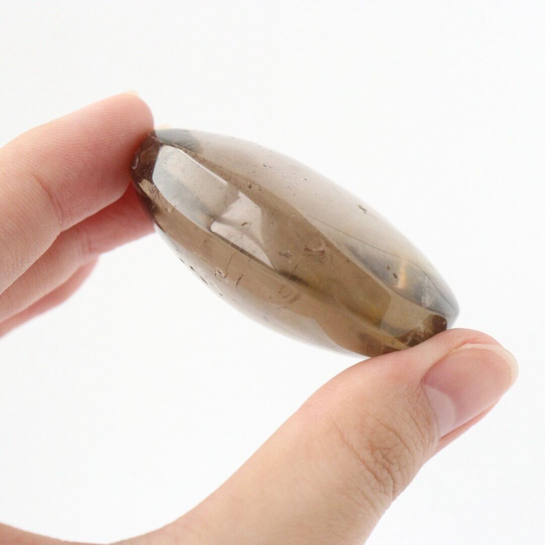 こちらは、透明度の高い結晶をもつスモーキークォーツ。エッジのある握り石の形に磨かれています。