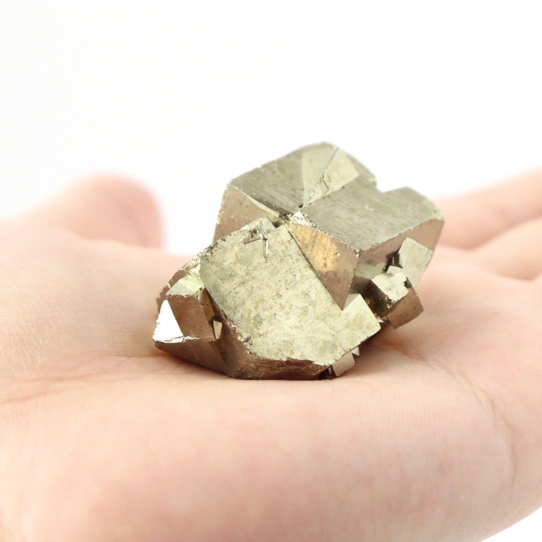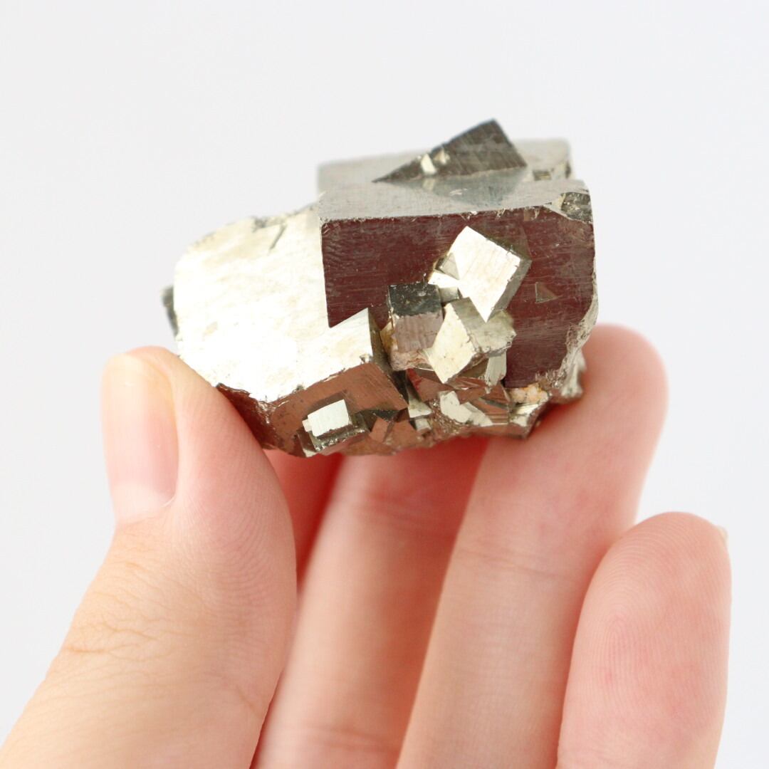 こちらの原石は、立方体の輪郭を残しながらも、他の結晶と折り重なった自然な造形が美しくそれぞれの面が光を反射して静かに輝きます。