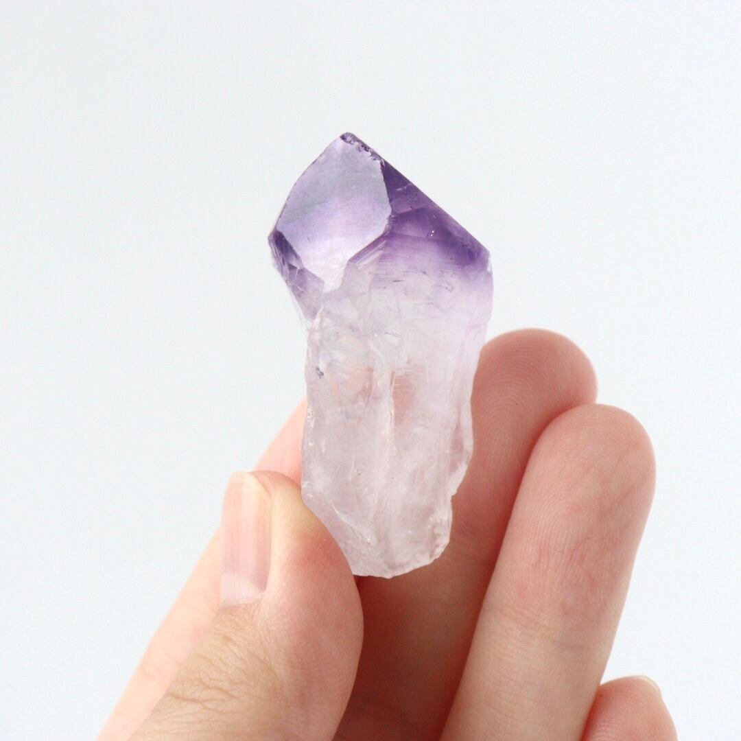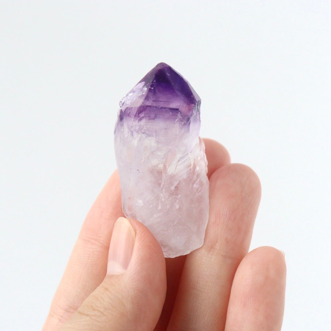 結晶上部にインクルージョンしたパープルと、透明感のある結晶体をもつ、アメジストの原石。