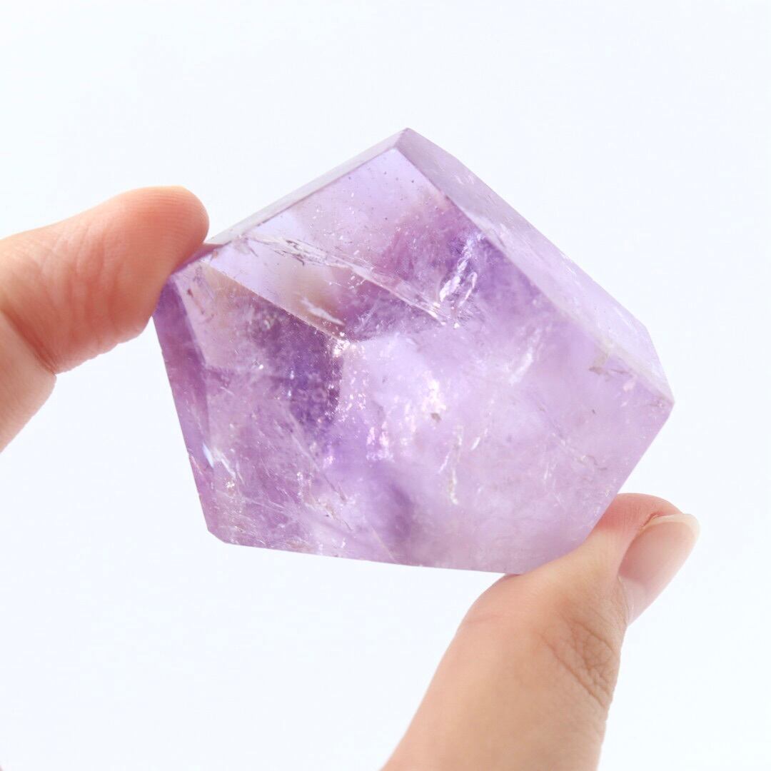 透明度の高い淡いパープルがやわらかに広がり、ランダムに磨き上げられた多角形の面が光を受け輝きます。