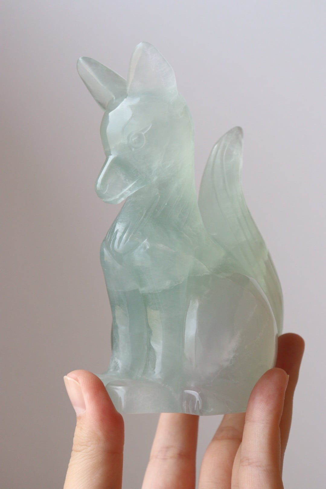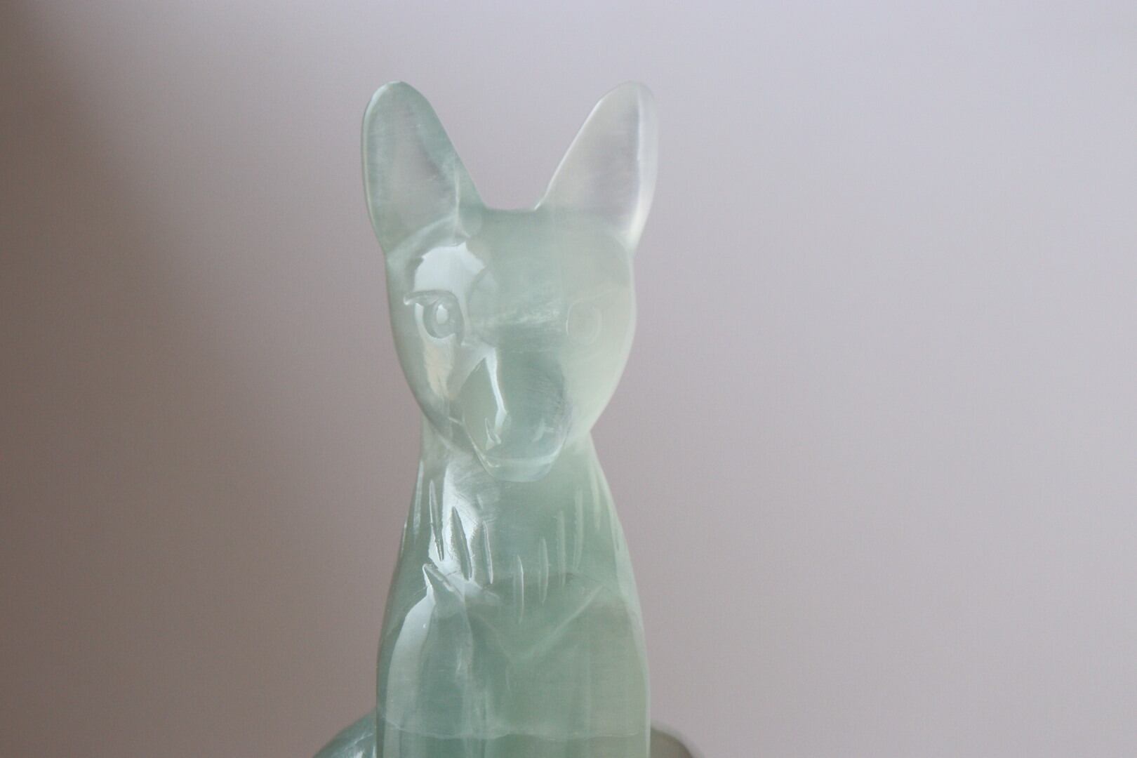 こちらのきつねは、結晶の透明度が非常に高く、澄み渡るグリーンの中にほのかなパープルが重なり合う、幻想的なピース。