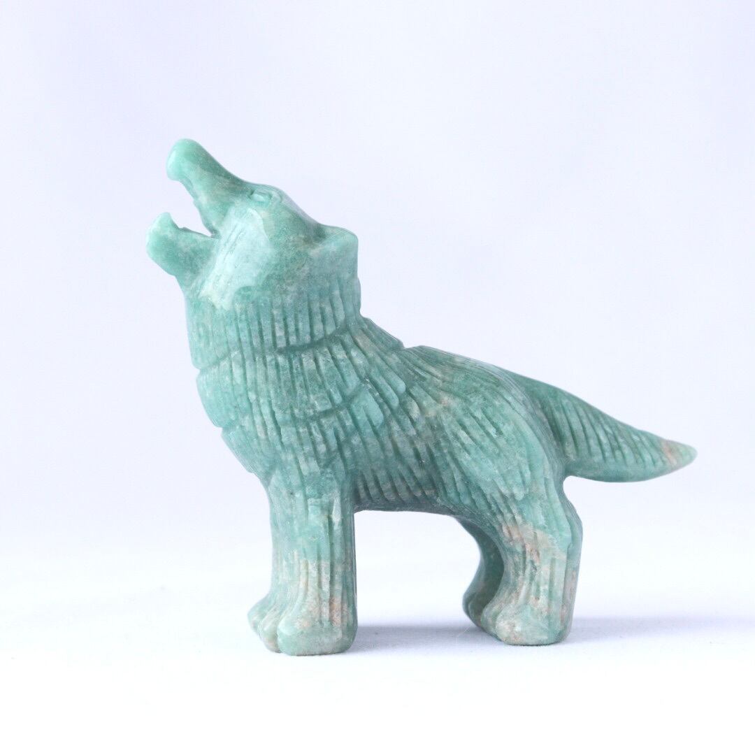 美しい発色の大きな大きなアマゾナイトが、繊細な狼の姿にカービングされています。