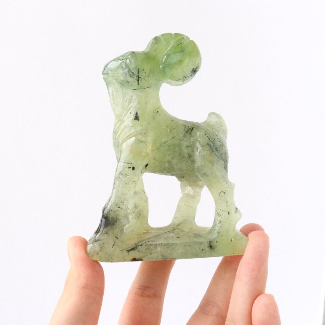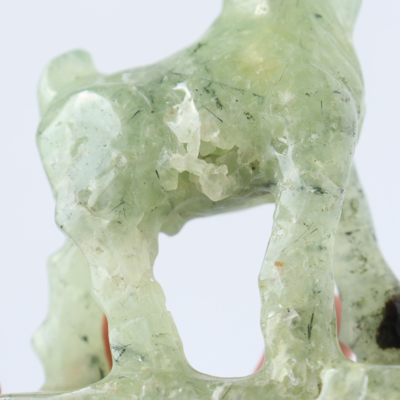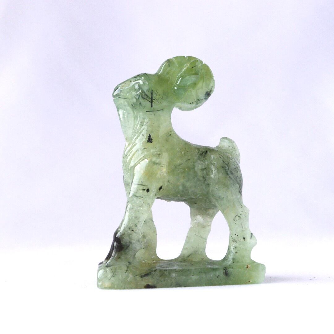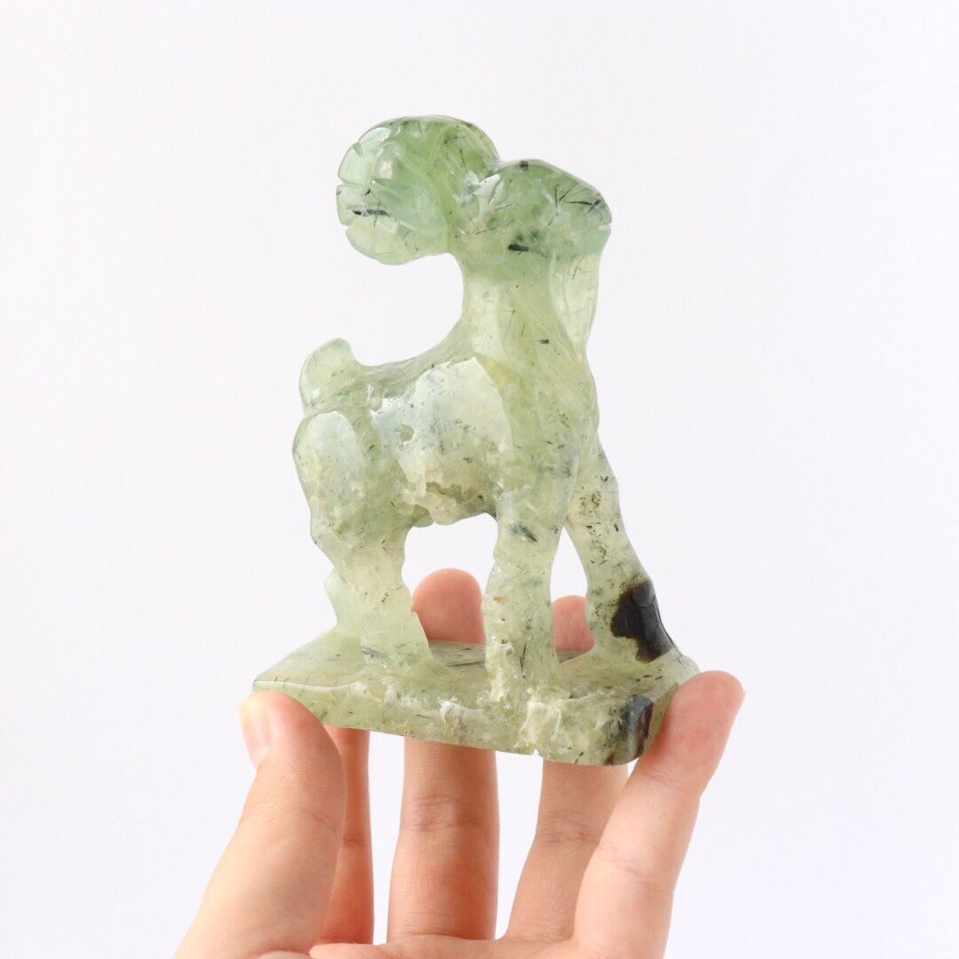 こちらのヤギは、透き通るようなプレナイトの結晶に濃いグリーンのエピドートが浮かび上がり、生命力を感じさせるひとつ。