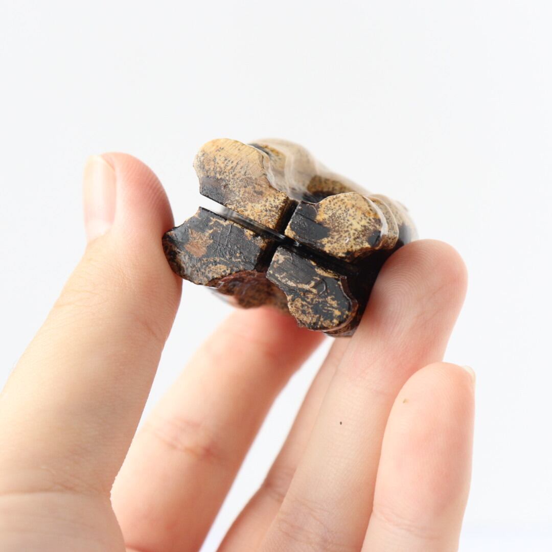 こちらは、ナチュラルブラウンを基調に、ブラックの模様が躍動的に広がるピクチャージャスパーのキリン。