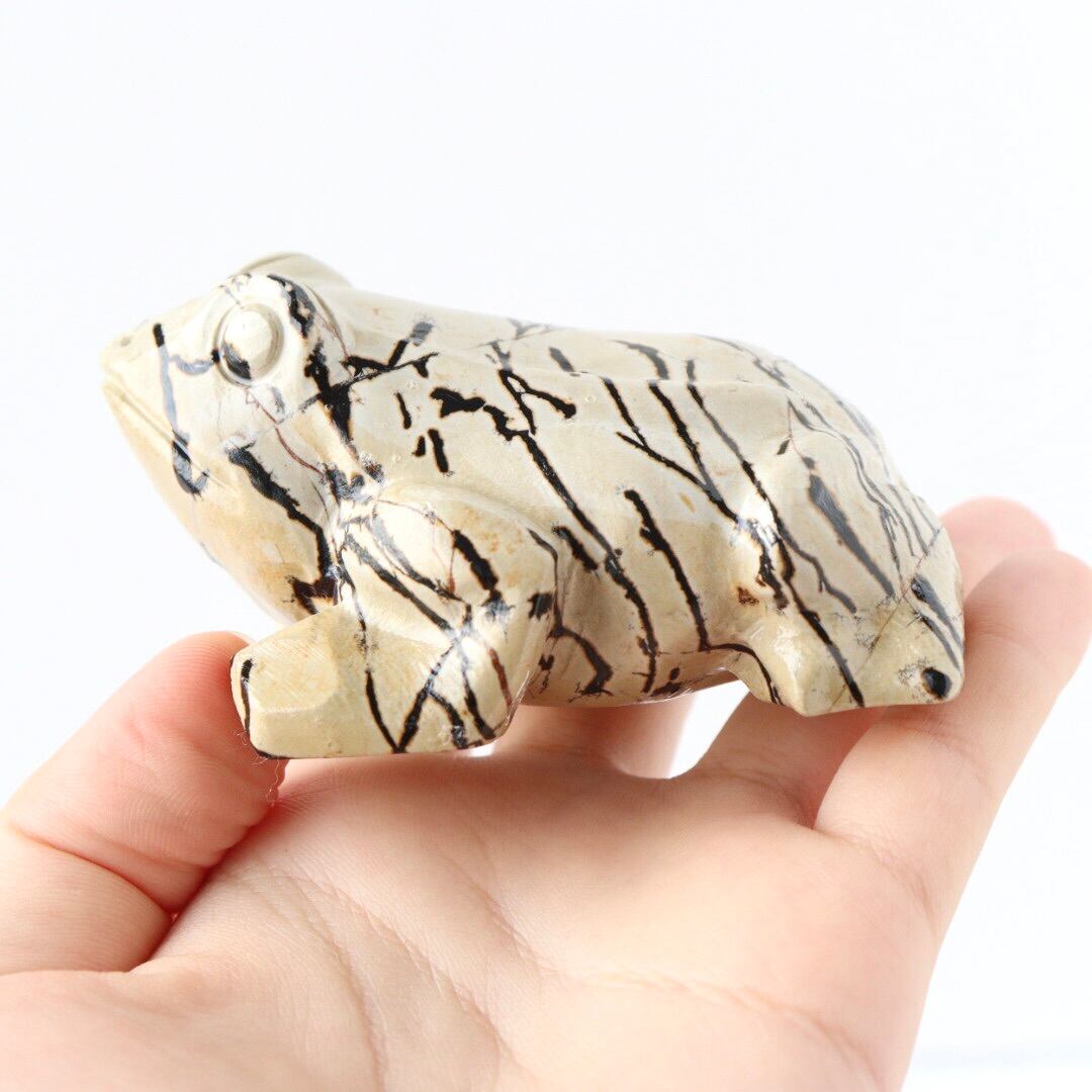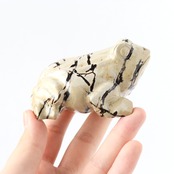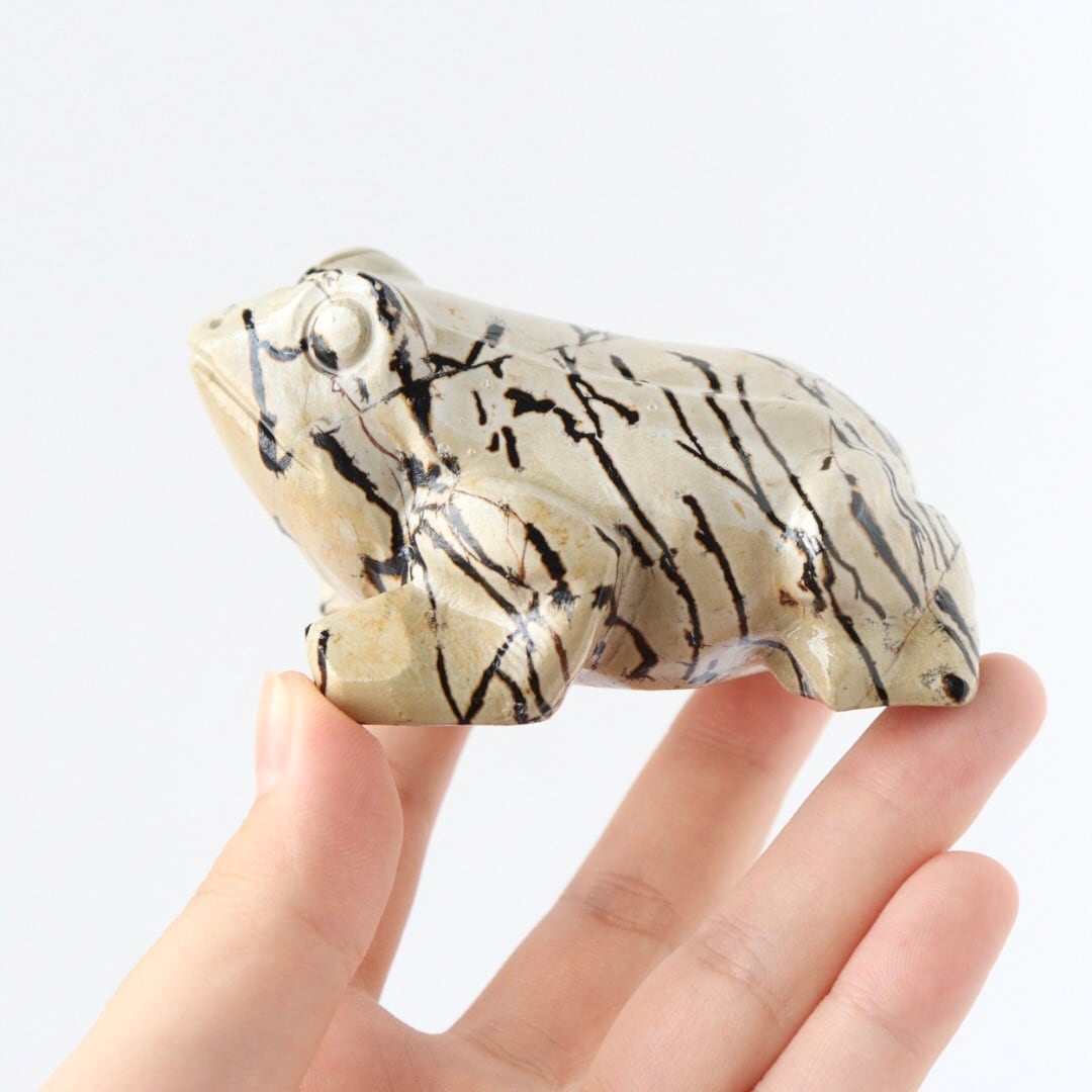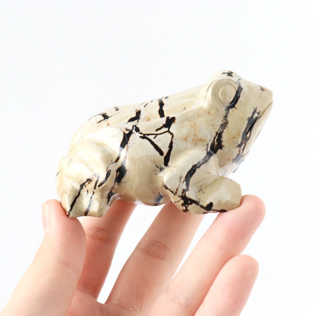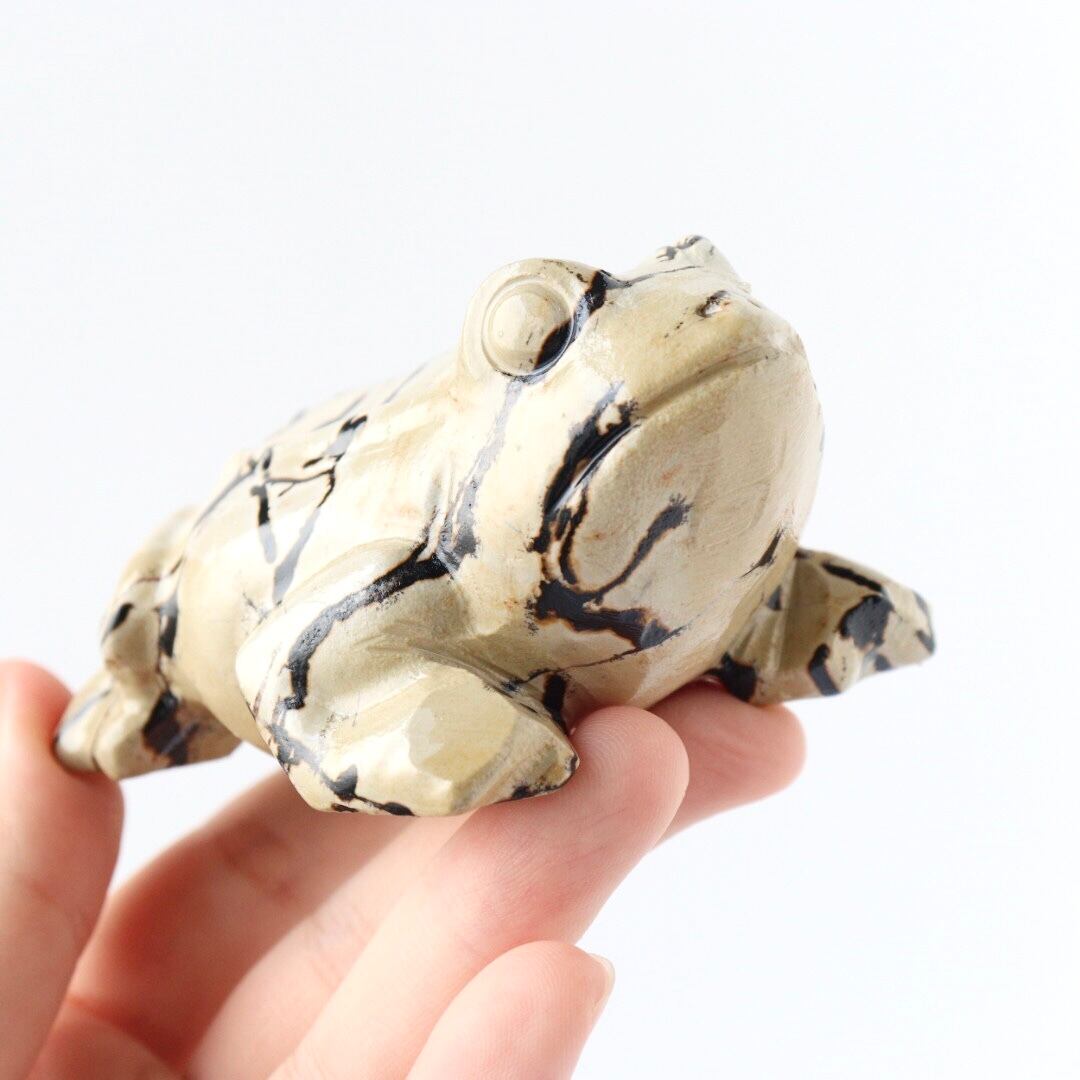 象牙色の素地に、墨で描かれたようなブラックのラインが描き出されたピクチャージャスパーのカエル。どっしりとしたカエルのフォルムは、見ているだけで福を呼んでくれそうな、温かみのある佇まいです。