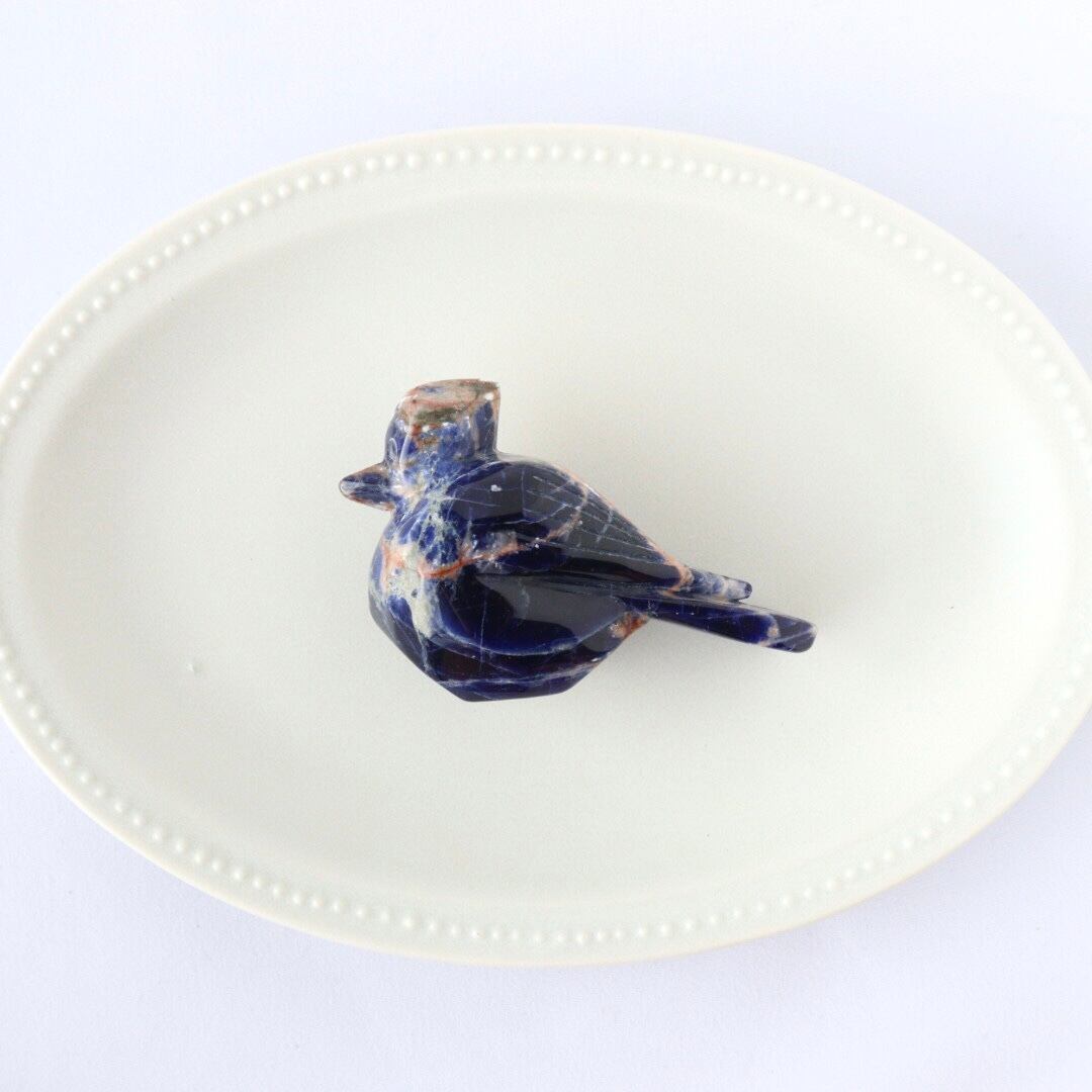 濃いブルーの素地に白い斑が柔らかく入り、見る角度によって表情や色合いの印象が変化します。手に取るたびに、石の美しさと鳥のかわいらしい魅力を感じられるひとつです。