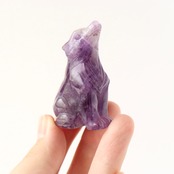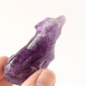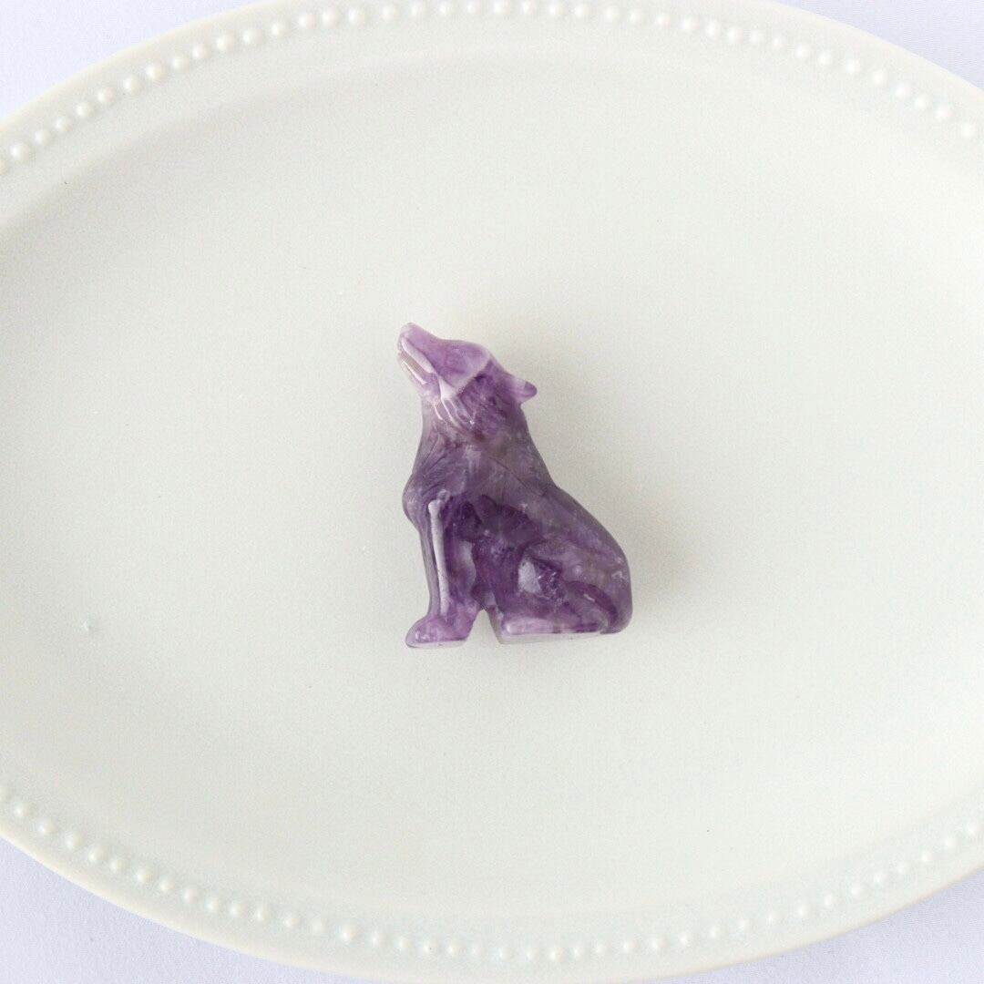 こちらは、濃いパープルのアメジストが狼の形にカービングされたひとつ。
