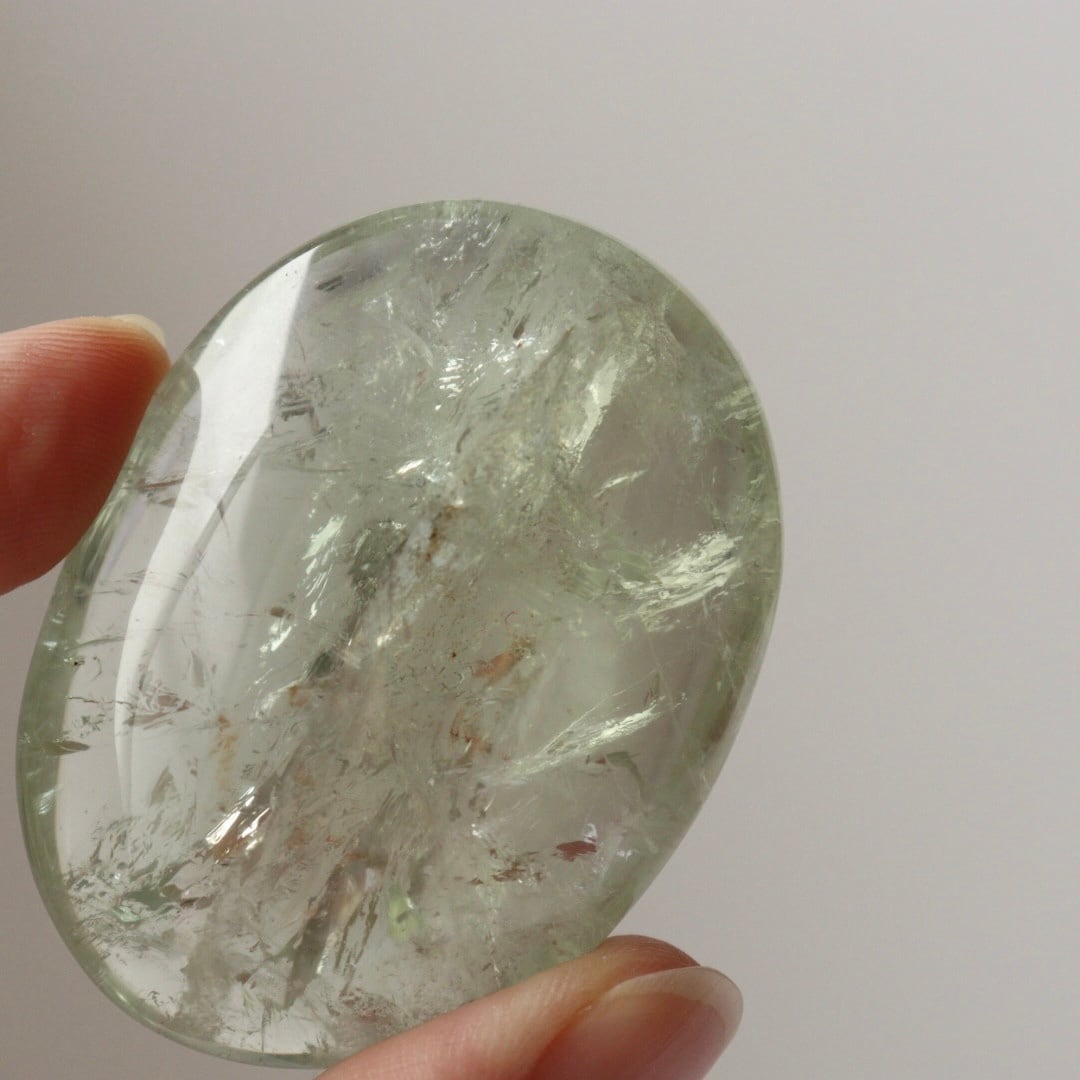 透明な美しい結晶を手に取り眺めると淡いグリーンの輝きが疲れてしまったこころを優しく包み、リラックスさせてくれます。