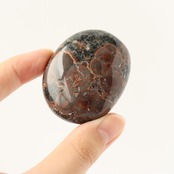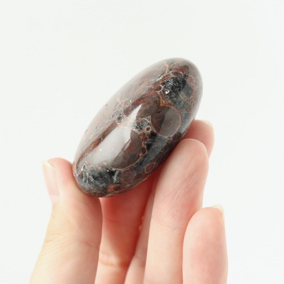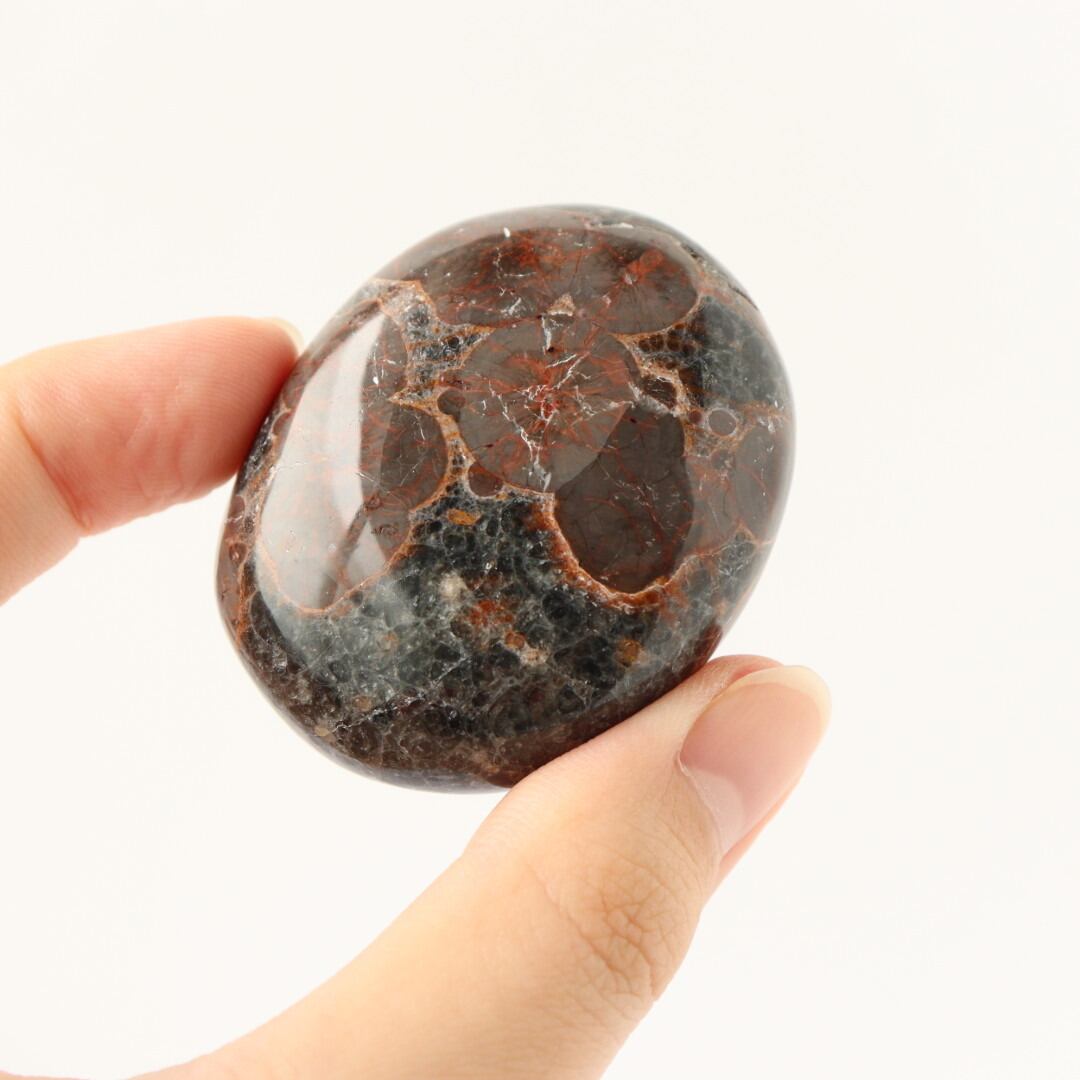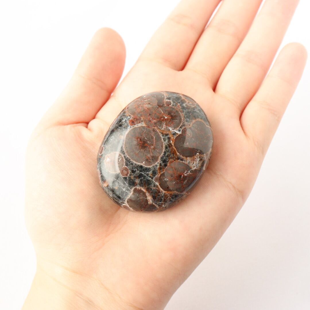 背景のブラックオブシディアンとブラウンカラーが絶妙で、デザインされたような水玉の広がりが見事に美しいオブシディアンの握り石です。