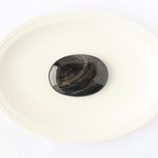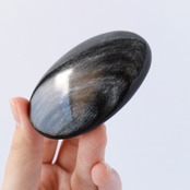 こちらは、オブシディアン(黒曜石)の中でも特に珍しい、見る角度によって銀色のシラーが浮かび上がるシルバーオブシディアン。
