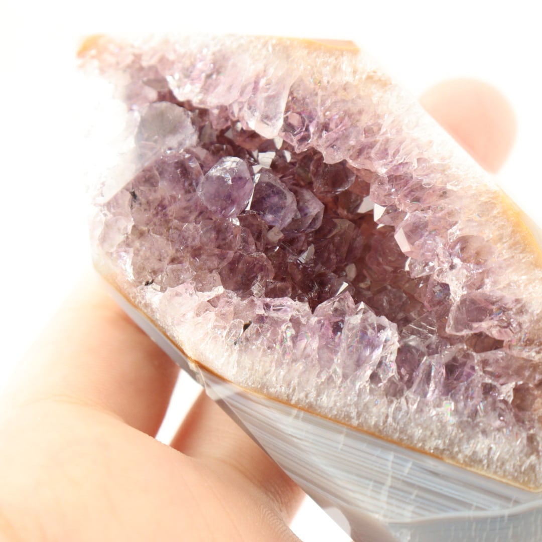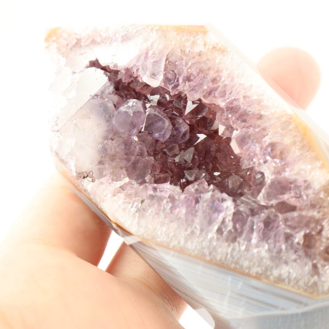 このアメジストはジオードが中心に成長しており、驚くほどのきらめきと透明感を放っています。