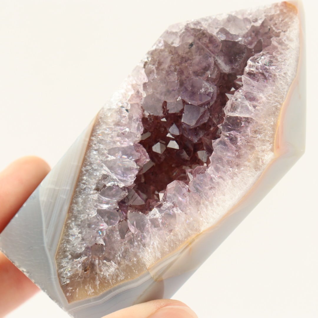繊細なアメジストの結晶たちが空洞を作り出したジオードをもつ、涼やかで美しいアメジストです。
