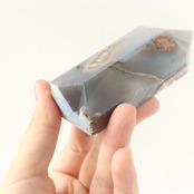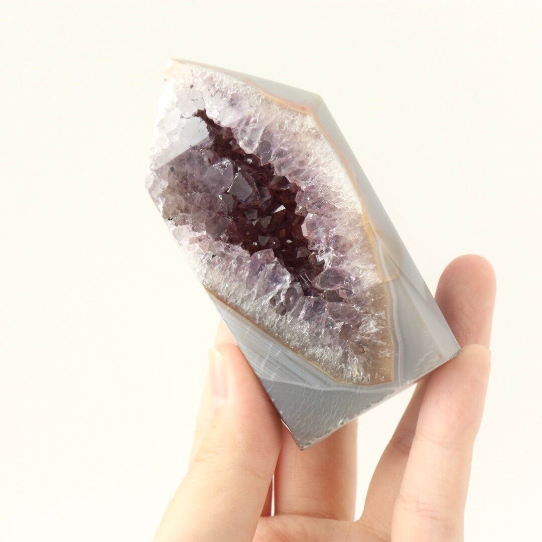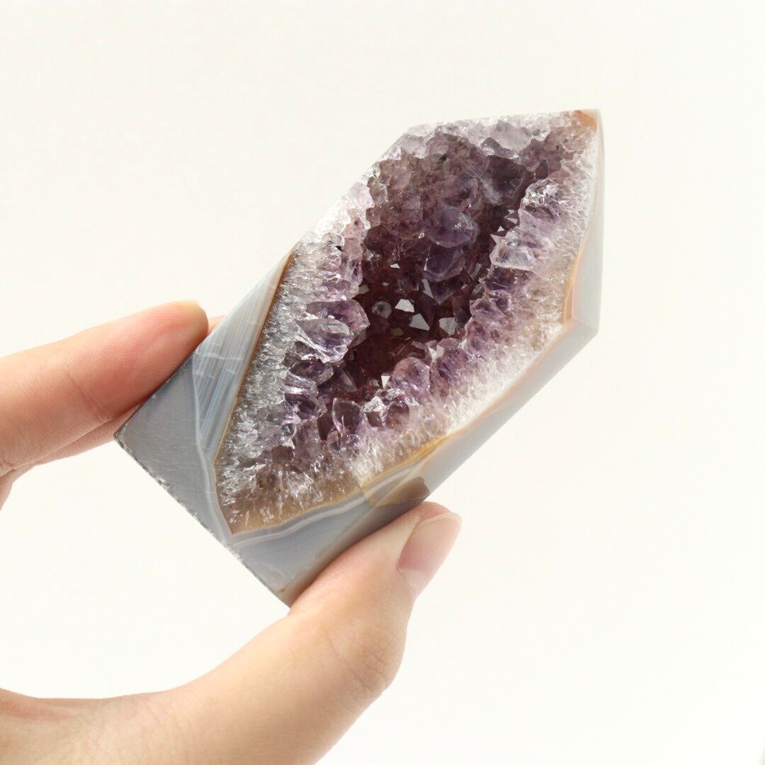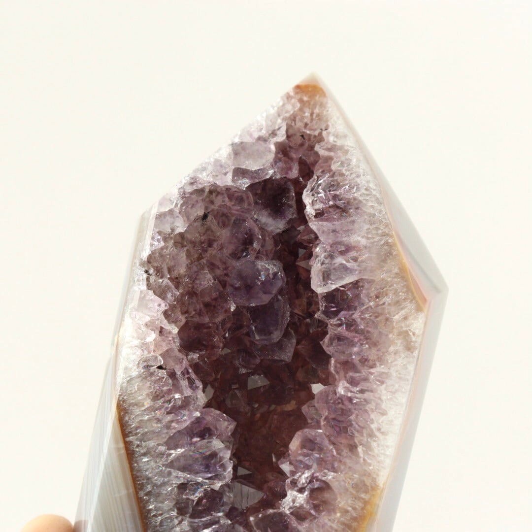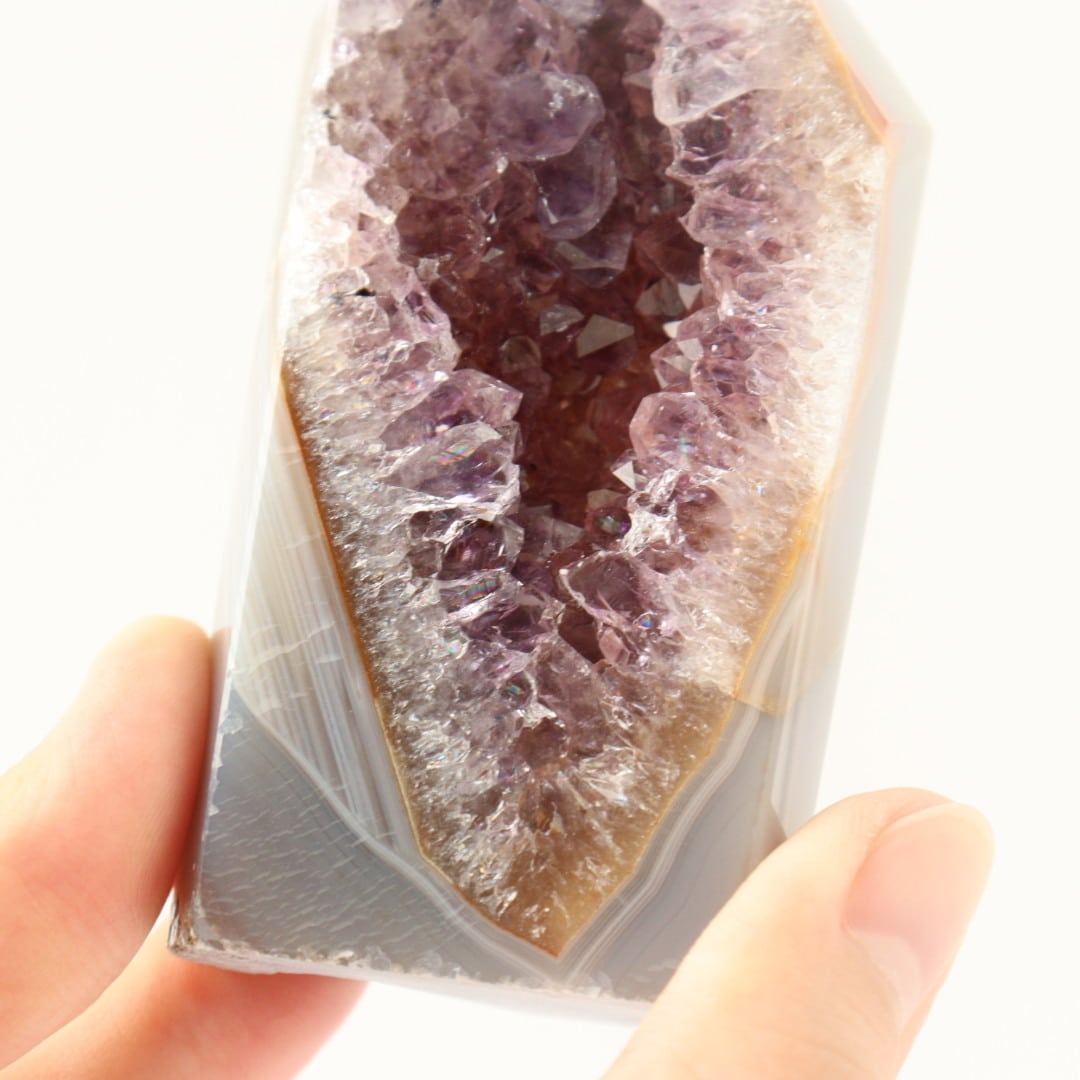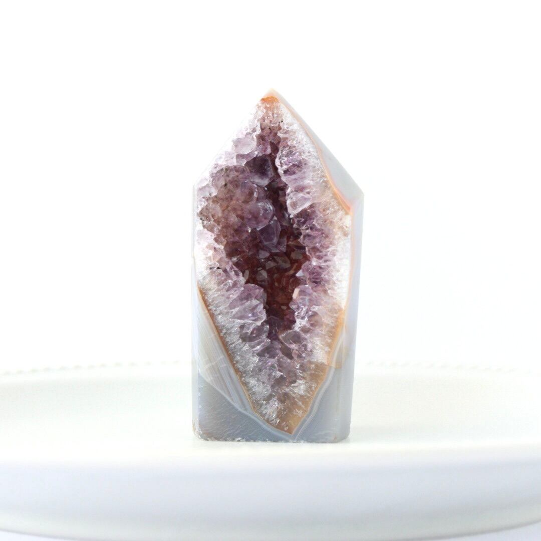 このタワーは、グレーアゲートを母体としながら、中心にアメジストのジオード(晶洞)を抱えた希少なピース。
