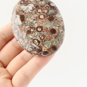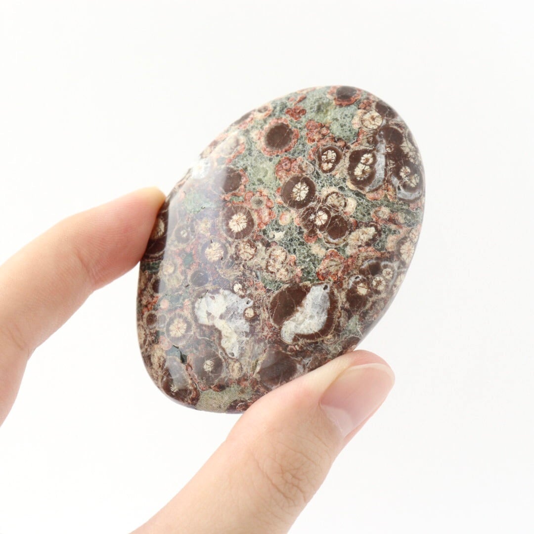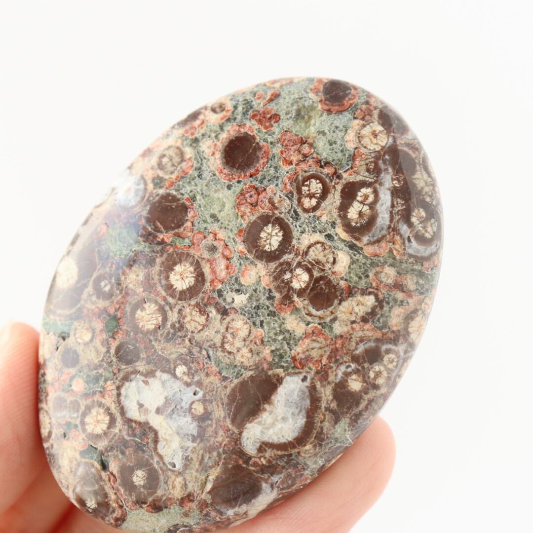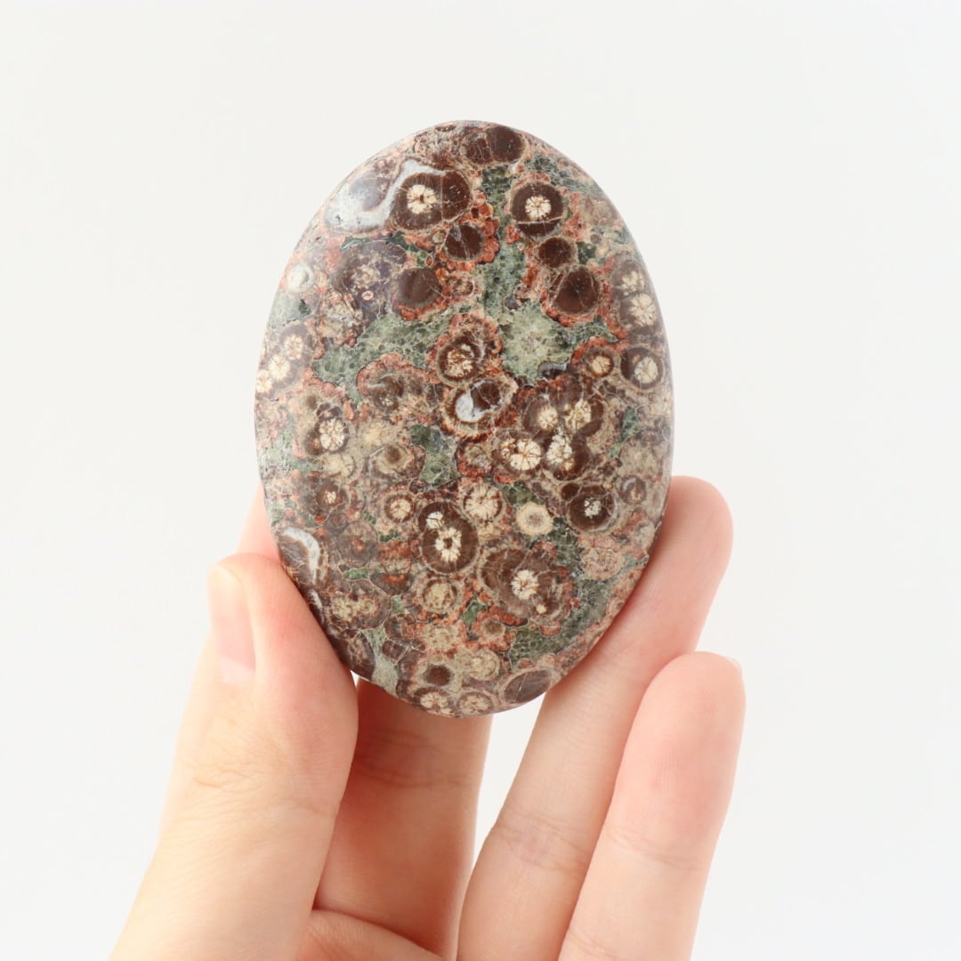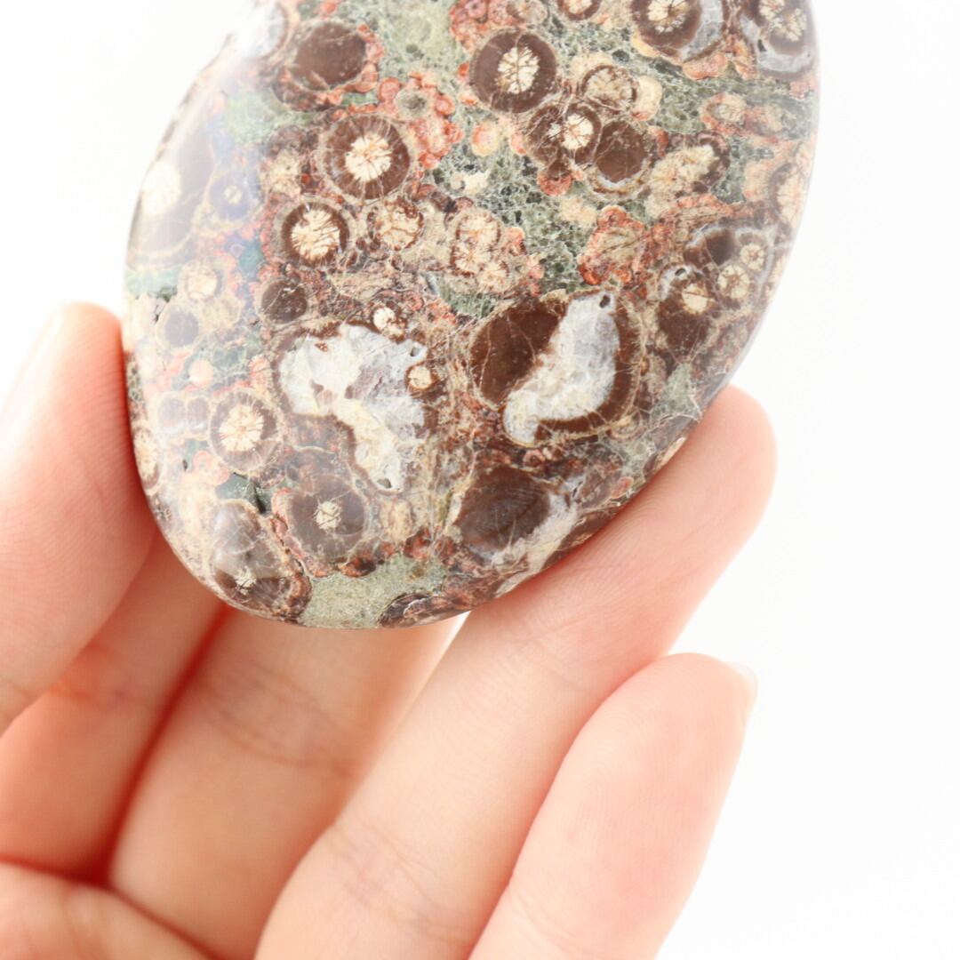 グリーンを基調に、レッドやブラウンが混ざり合い、まるで花模様のような広がりを見せる美しいクロコダイルジャスパーの握り石。