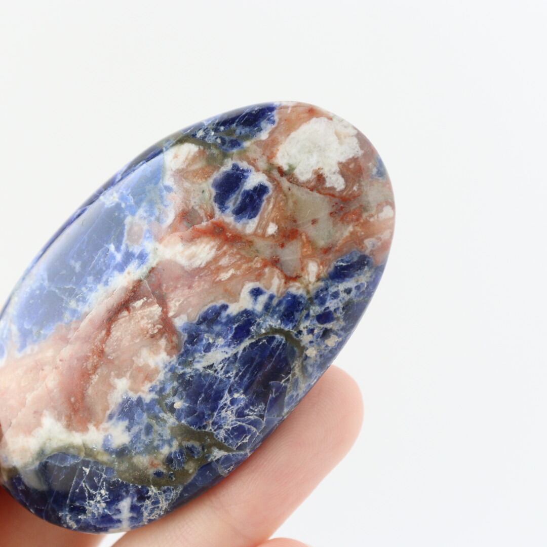 こちらは、地球を思わせる深いブルーに、ホワイトと水彩画のようなレッドカラーが入った、ソーダライトの握り石。