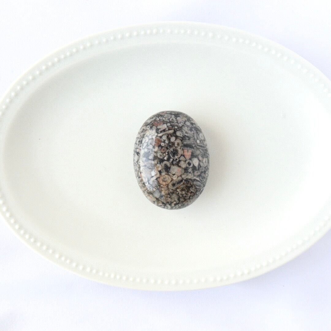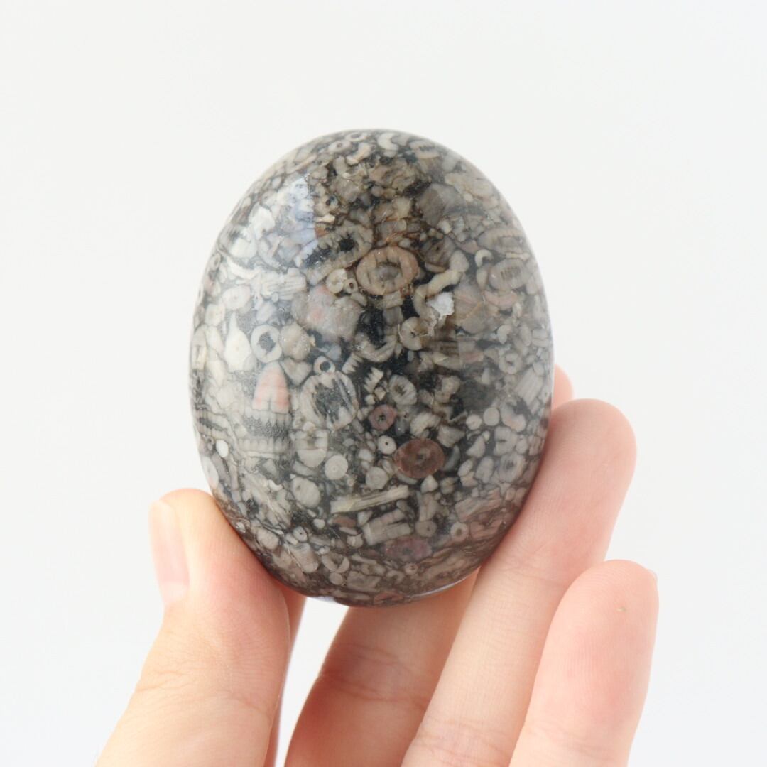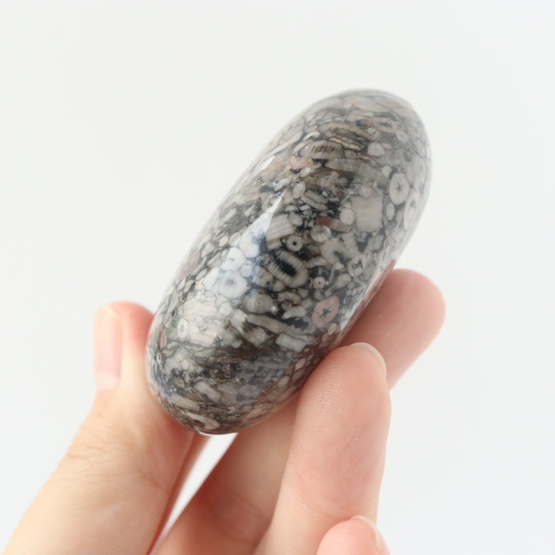 こちらは、ブラックの母岩の中にウミユリが多く浮かび上がった不思議な模様をもつ握り石。