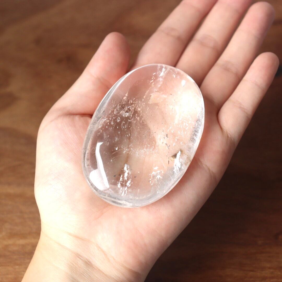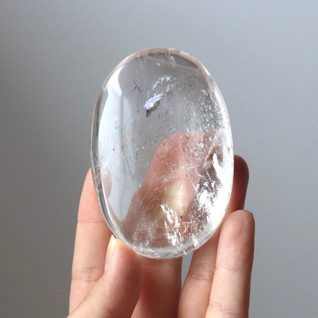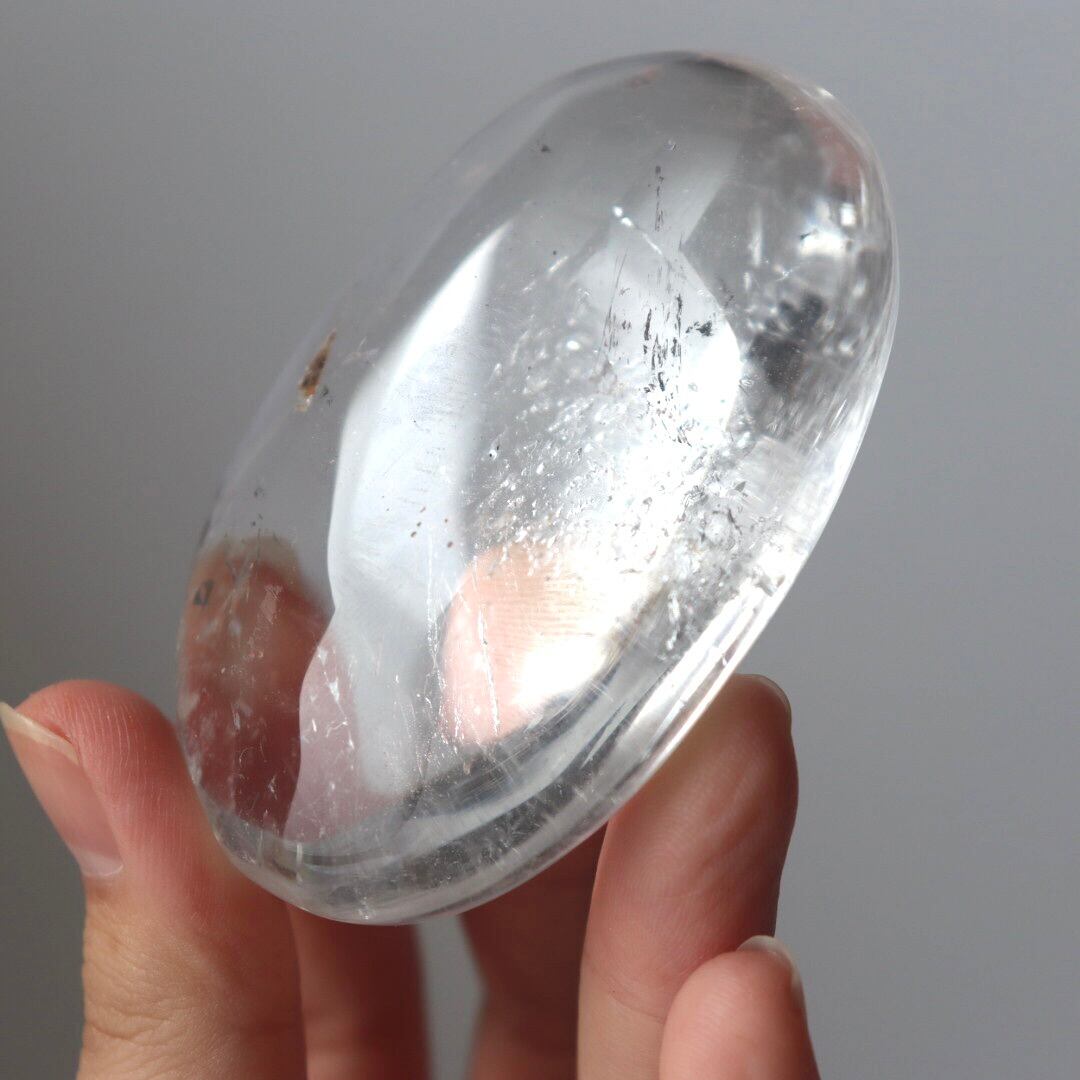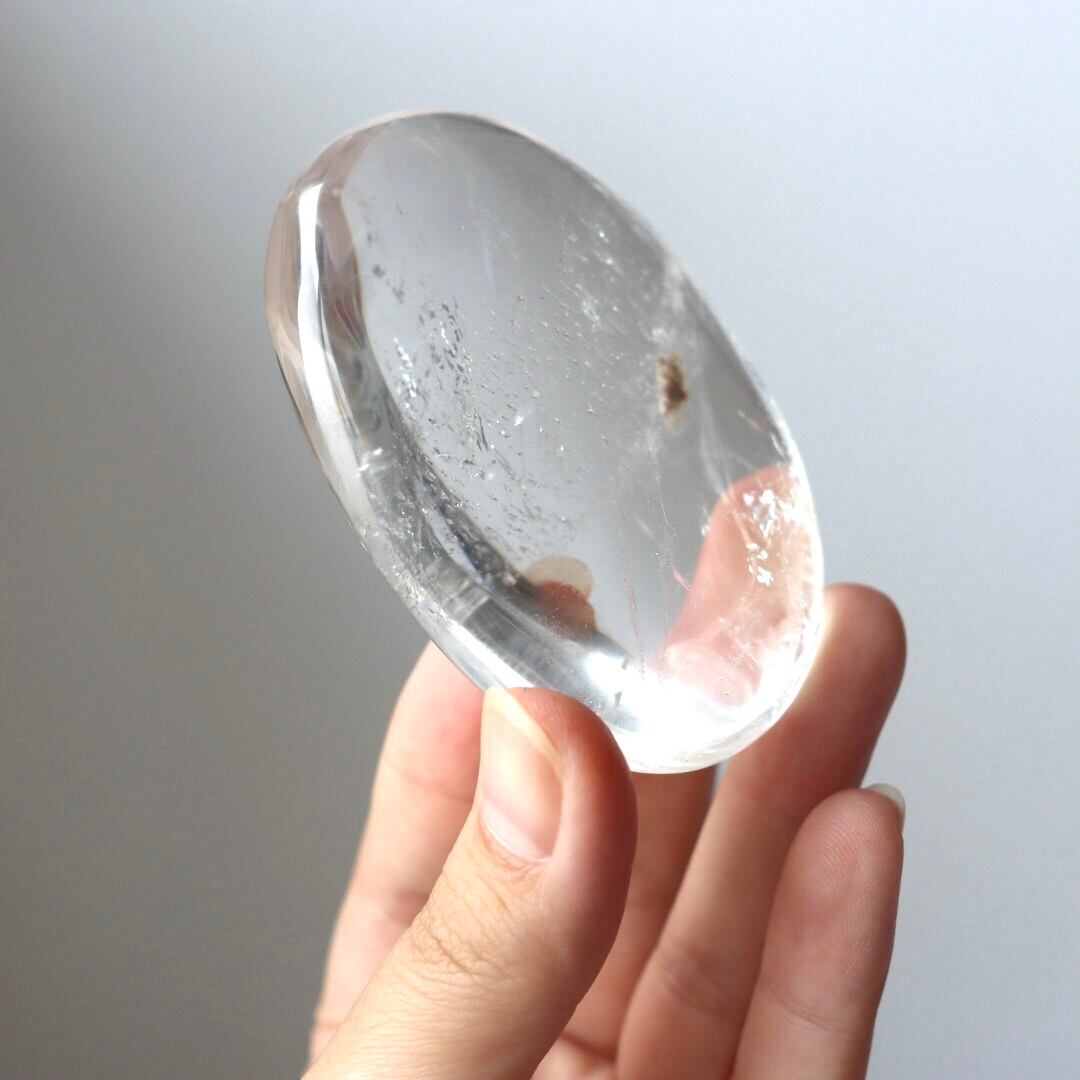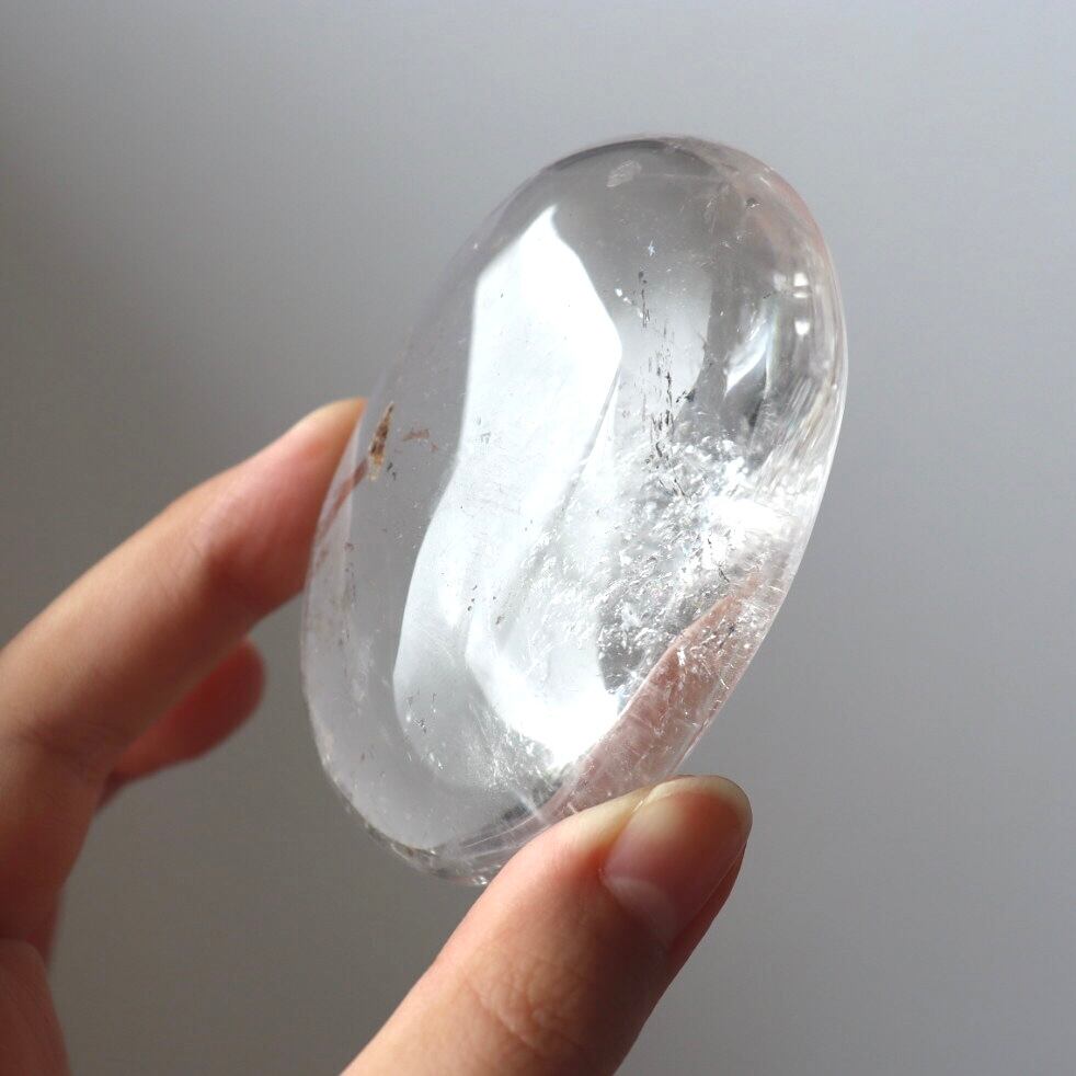 澄んだ水をそのまま閉じ込めたかのように透明度の高い輝きを放つ、クリアクォーツの大きな握り石。