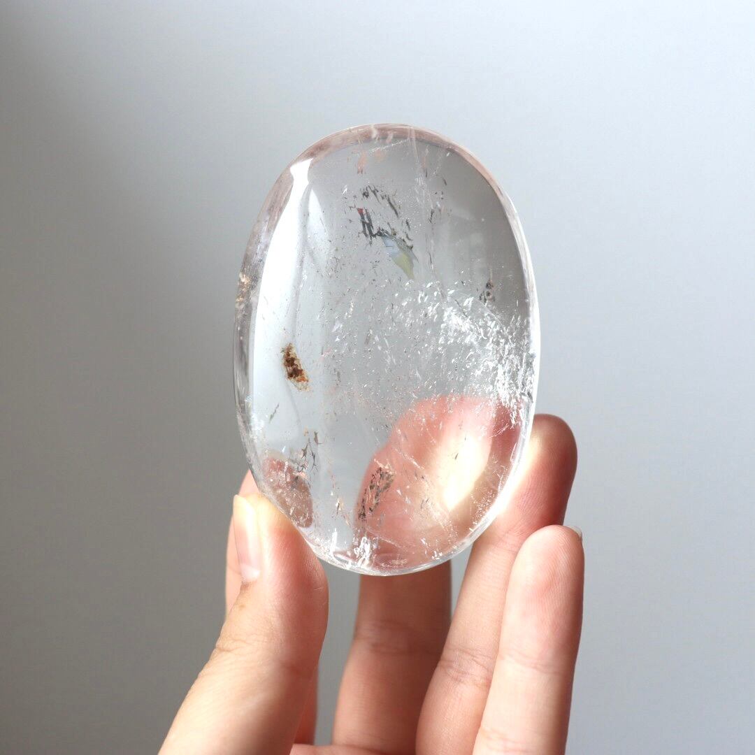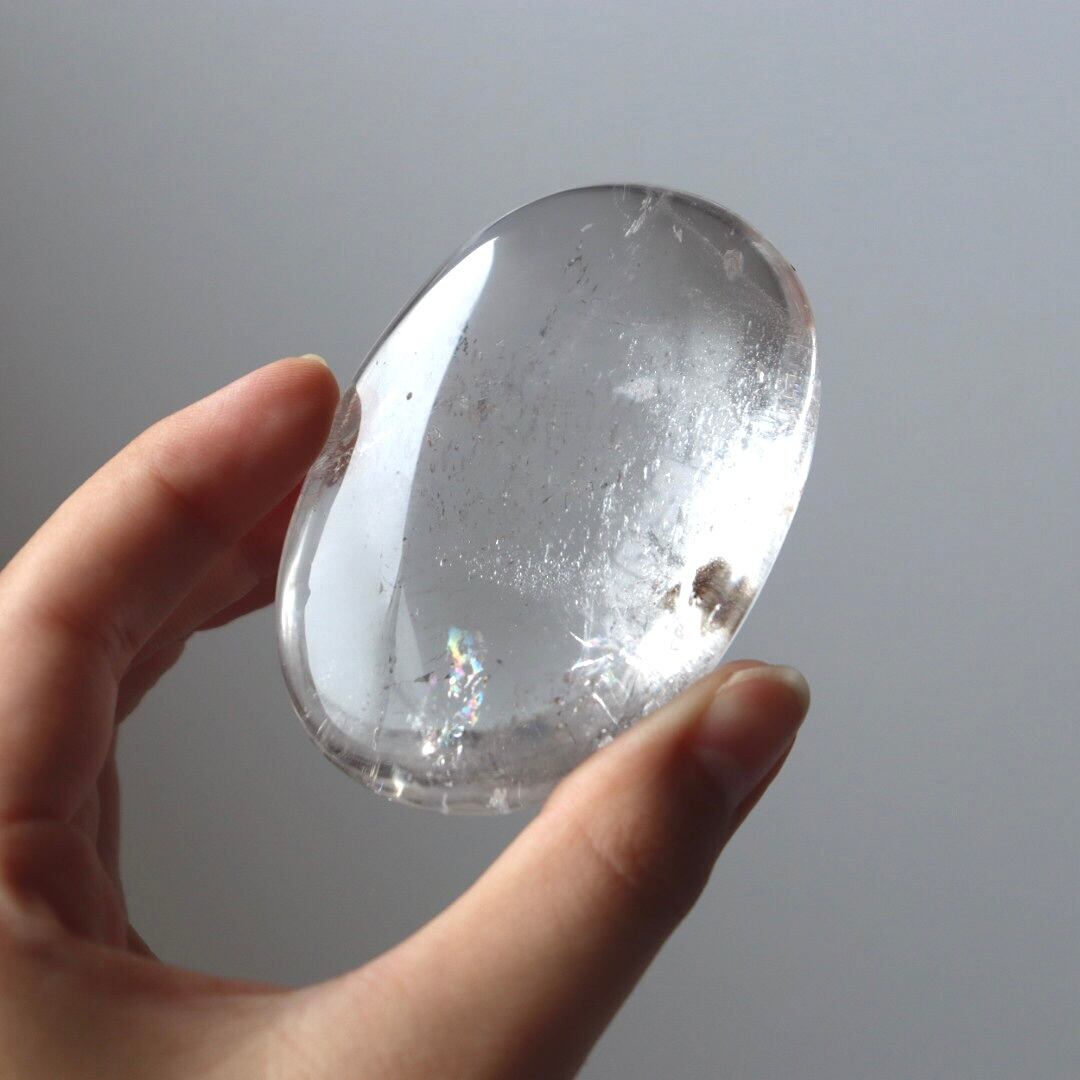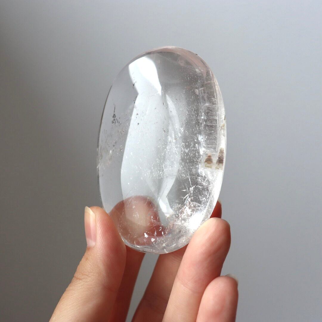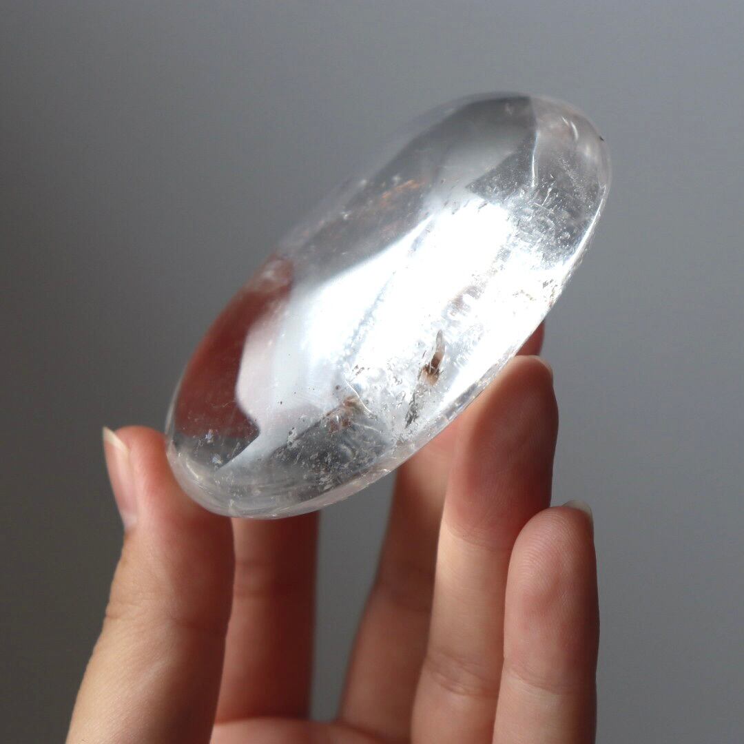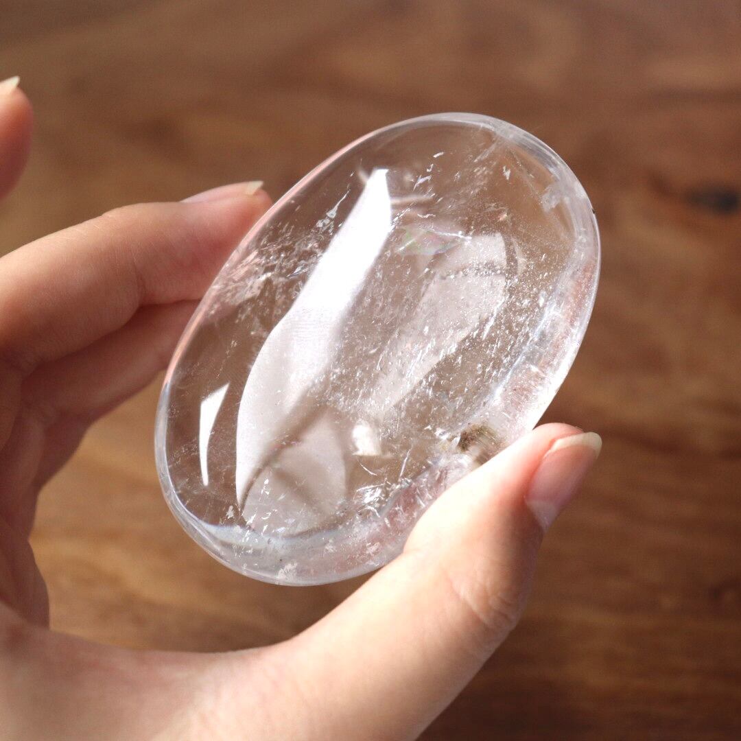 澄んだ水をそのまま閉じ込めたかのように透明度の高い輝きを放つ、クリアクォーツの大きな握り石。