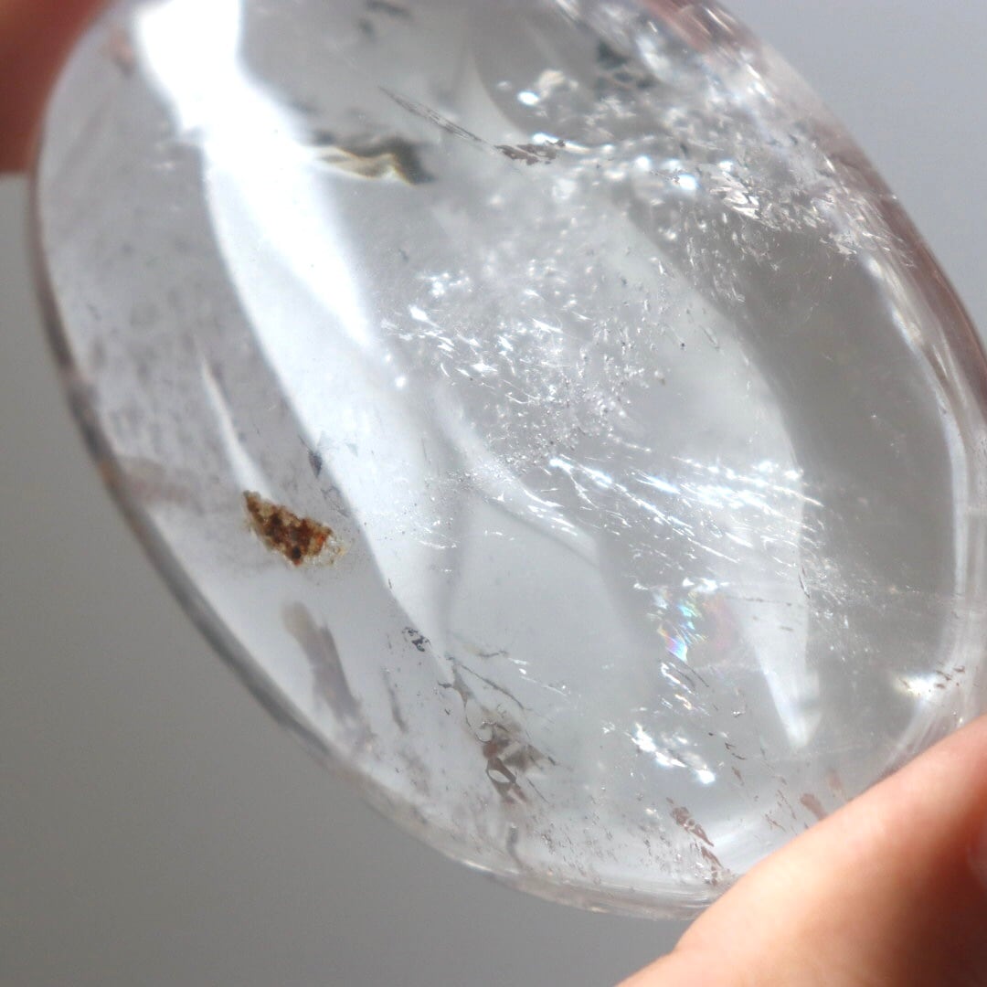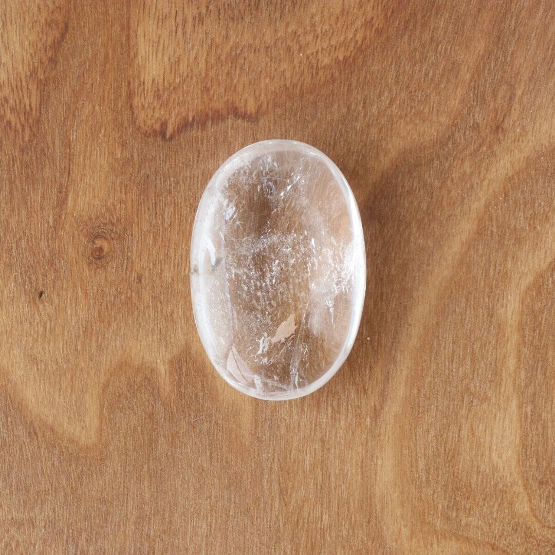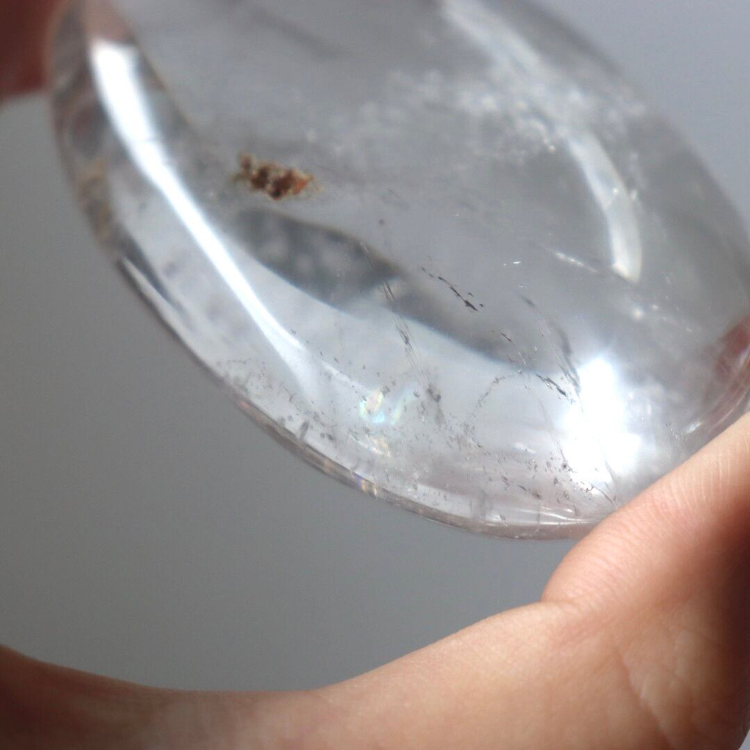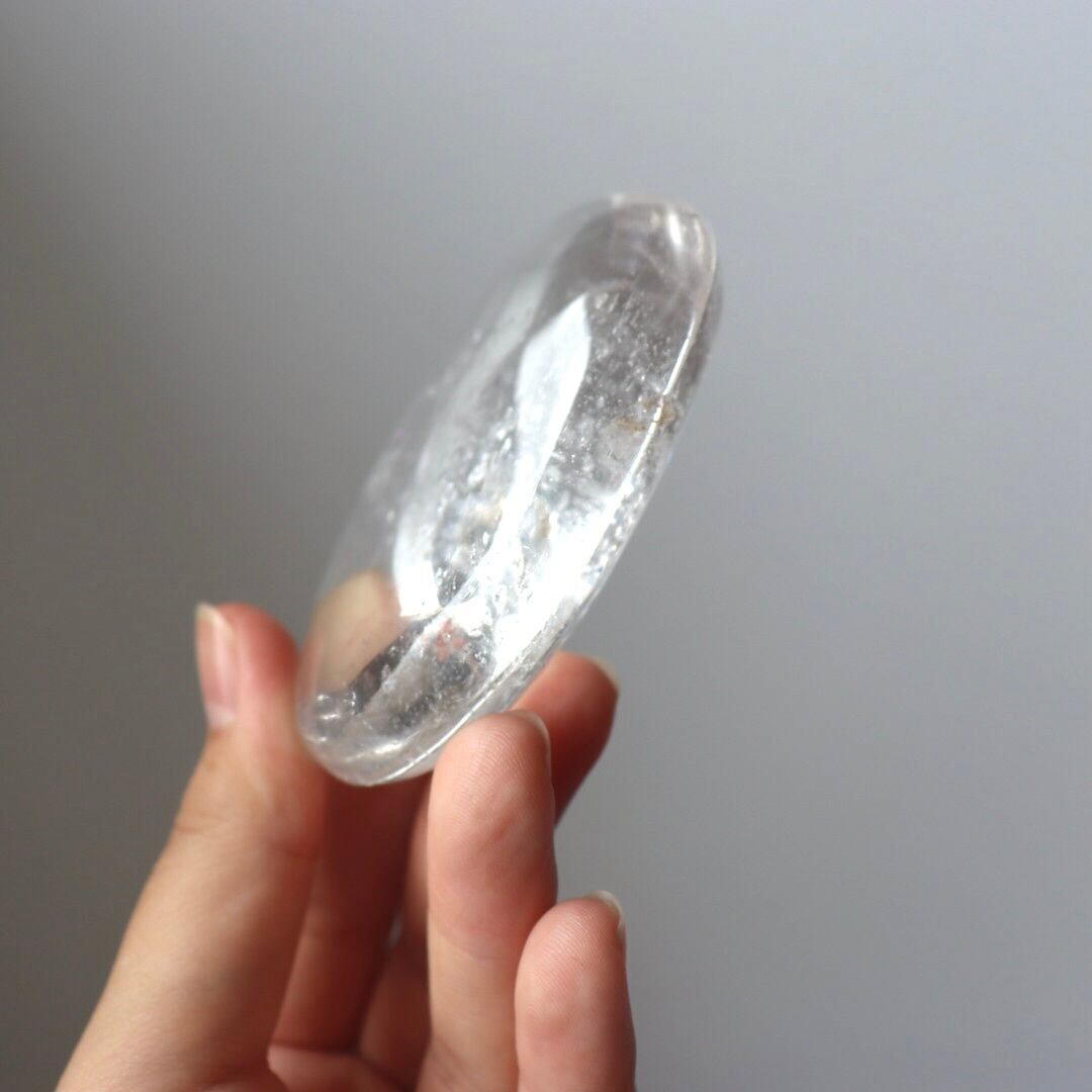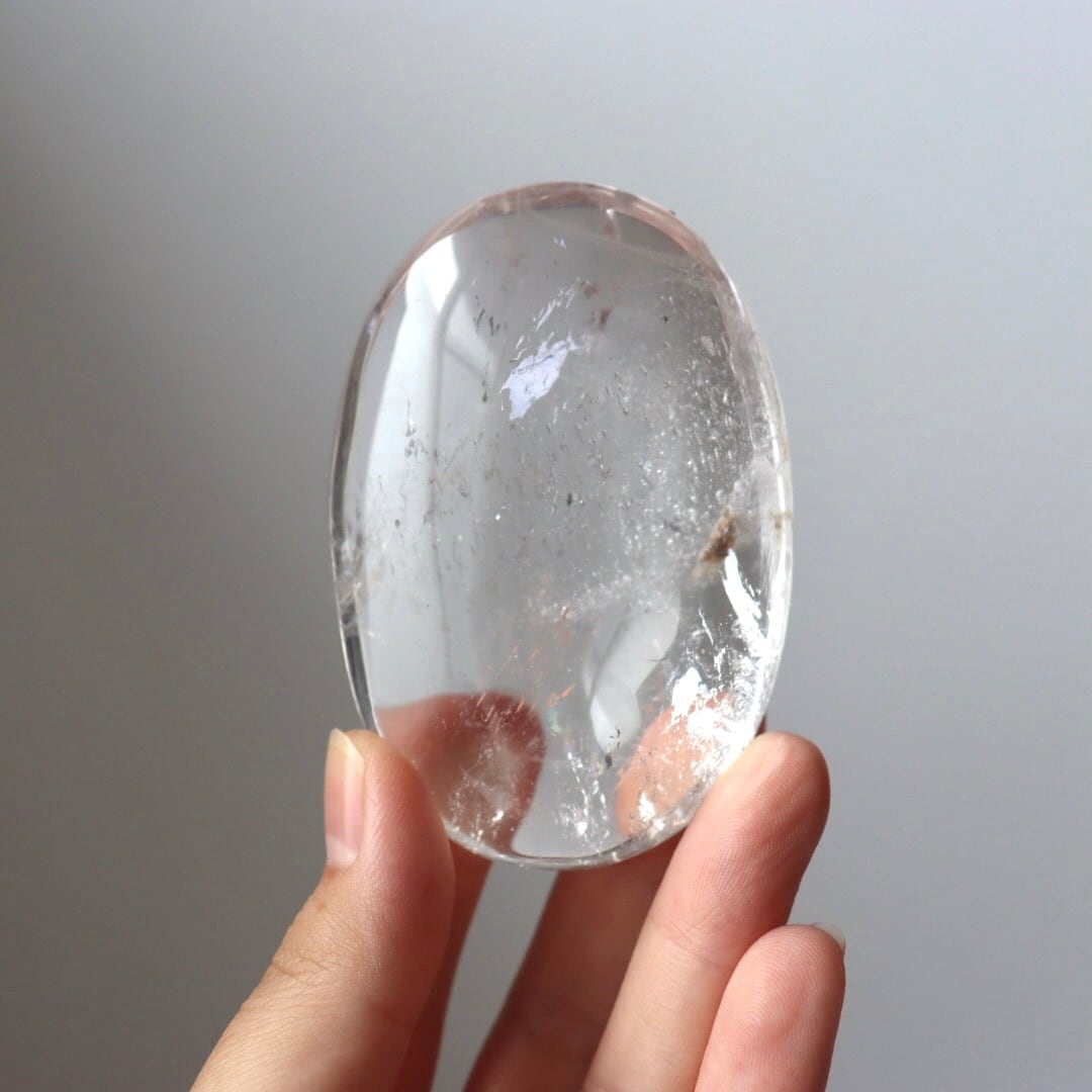 澄んだ水をそのまま閉じ込めたかのように透明度の高い輝きを放つ、クリアクォーツの大きな握り石。