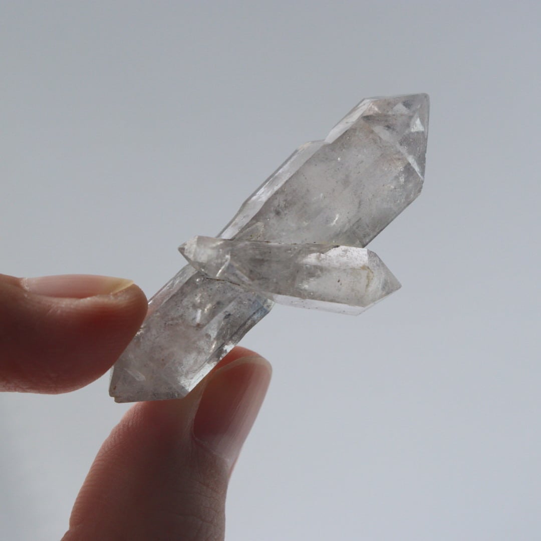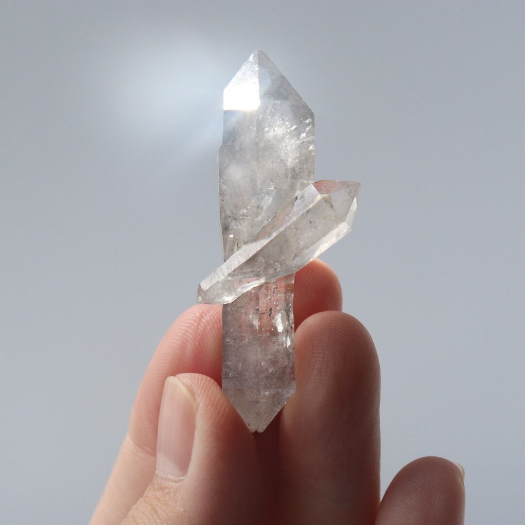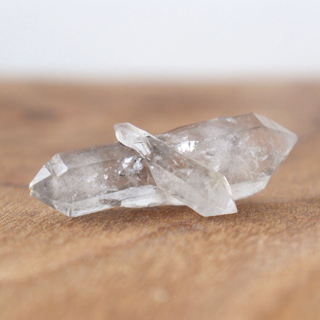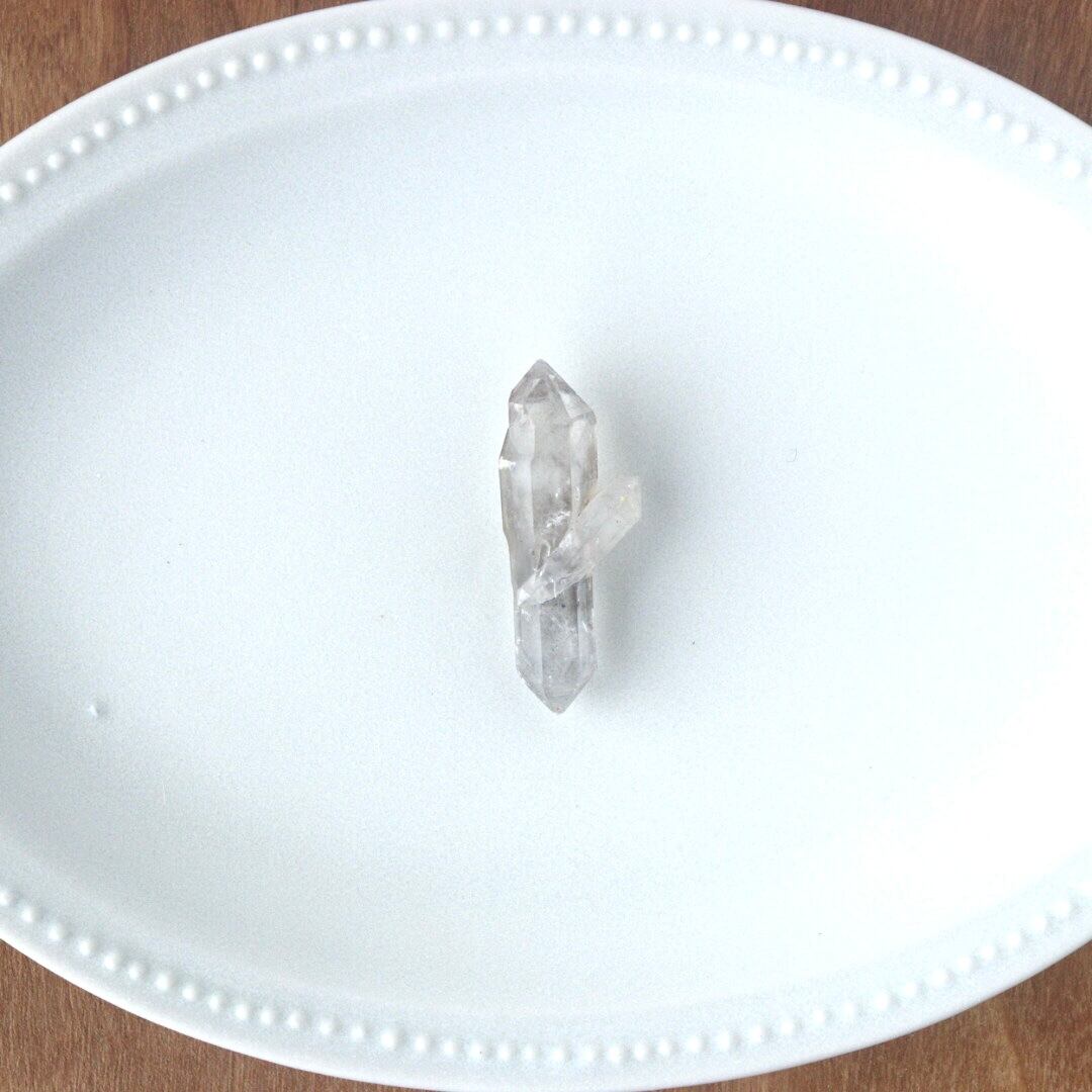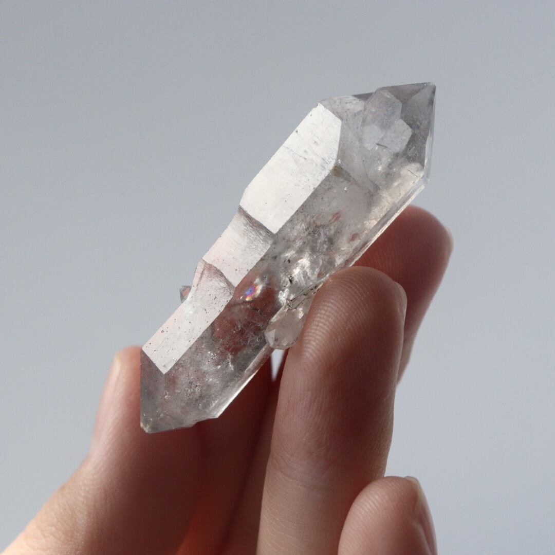 両端が尖った自然のポイント型に形成された、透明度の高いクリアクォーツ。