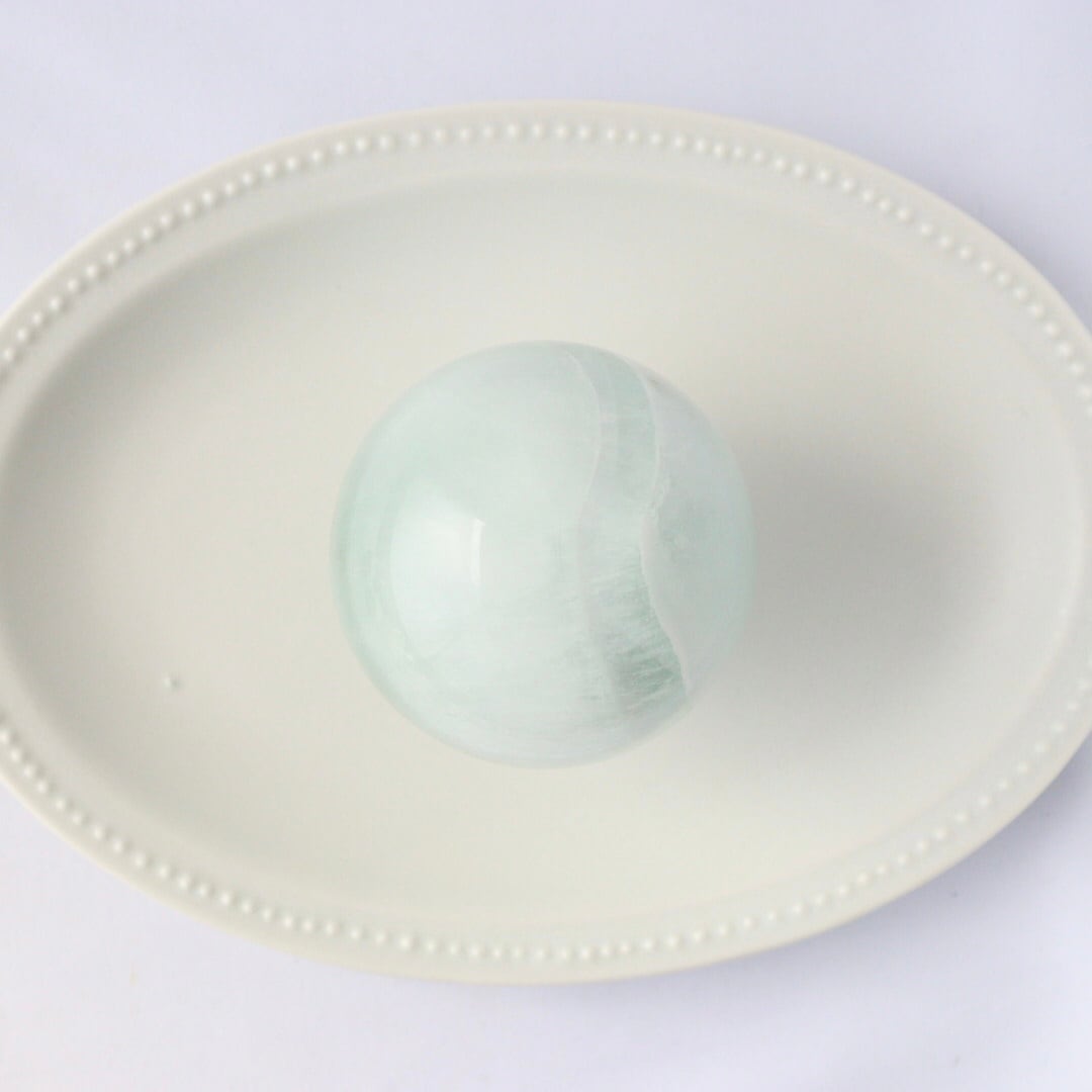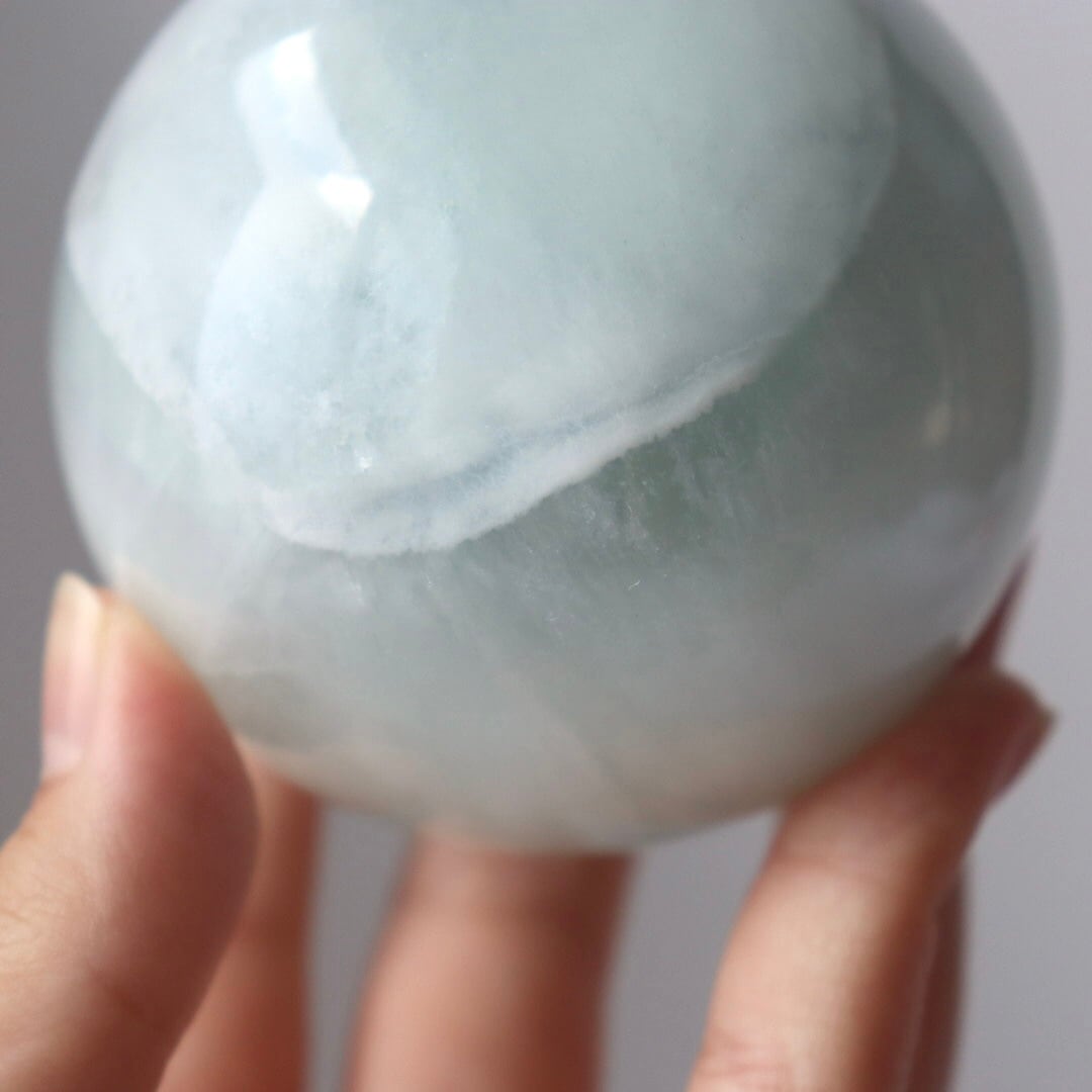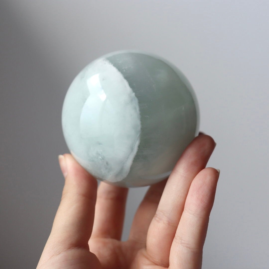 淡いブルーに透明感を湛えた、シルキーフローライトのスフィア。