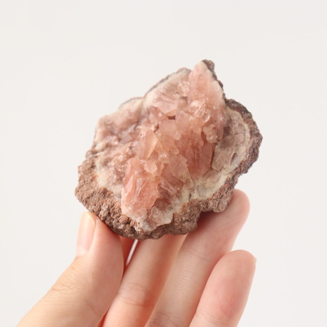 こちらは、ほんのりとピンクを帯びた母岩から、半円状にジオードをなすようにローズピンクの結晶が育ったクラスター。