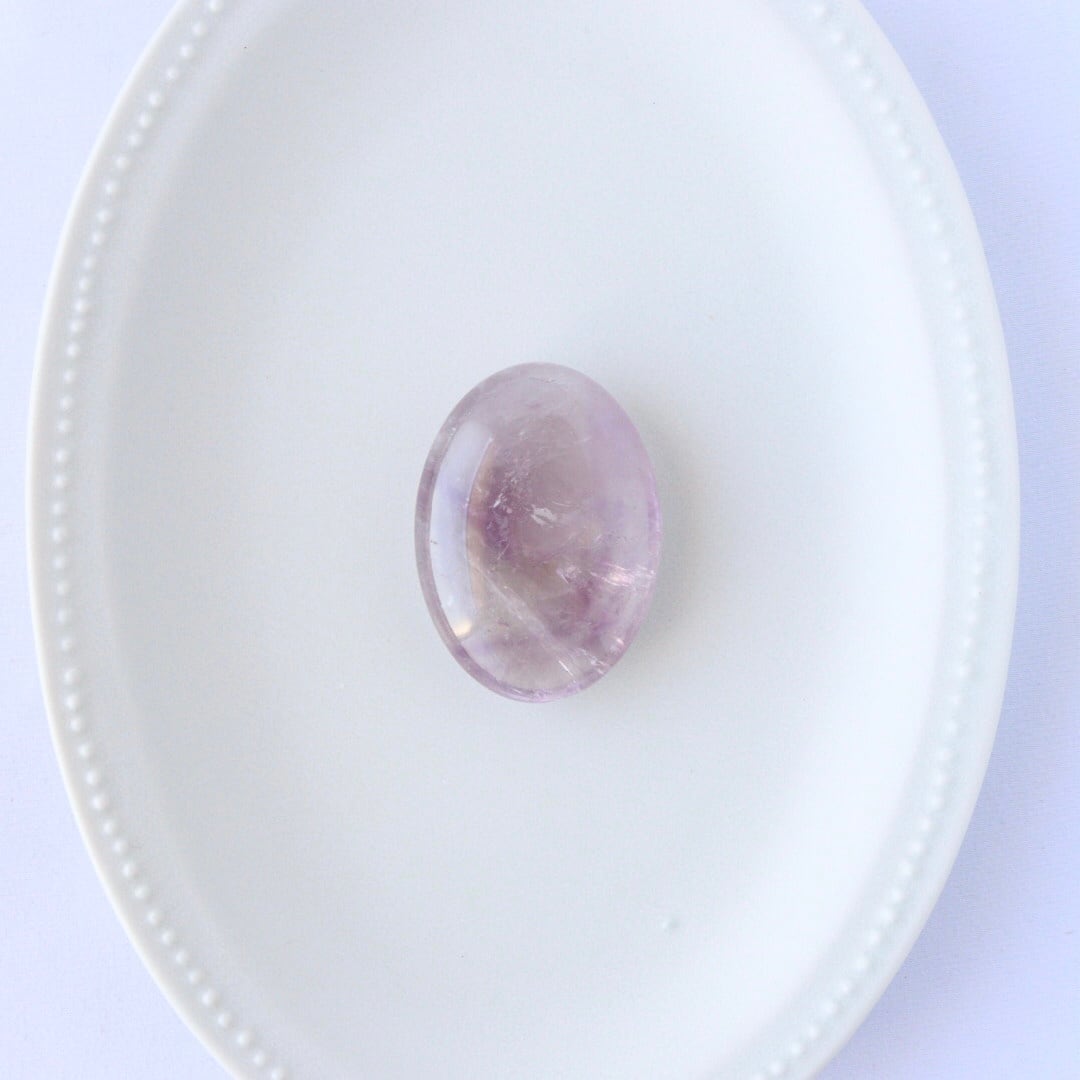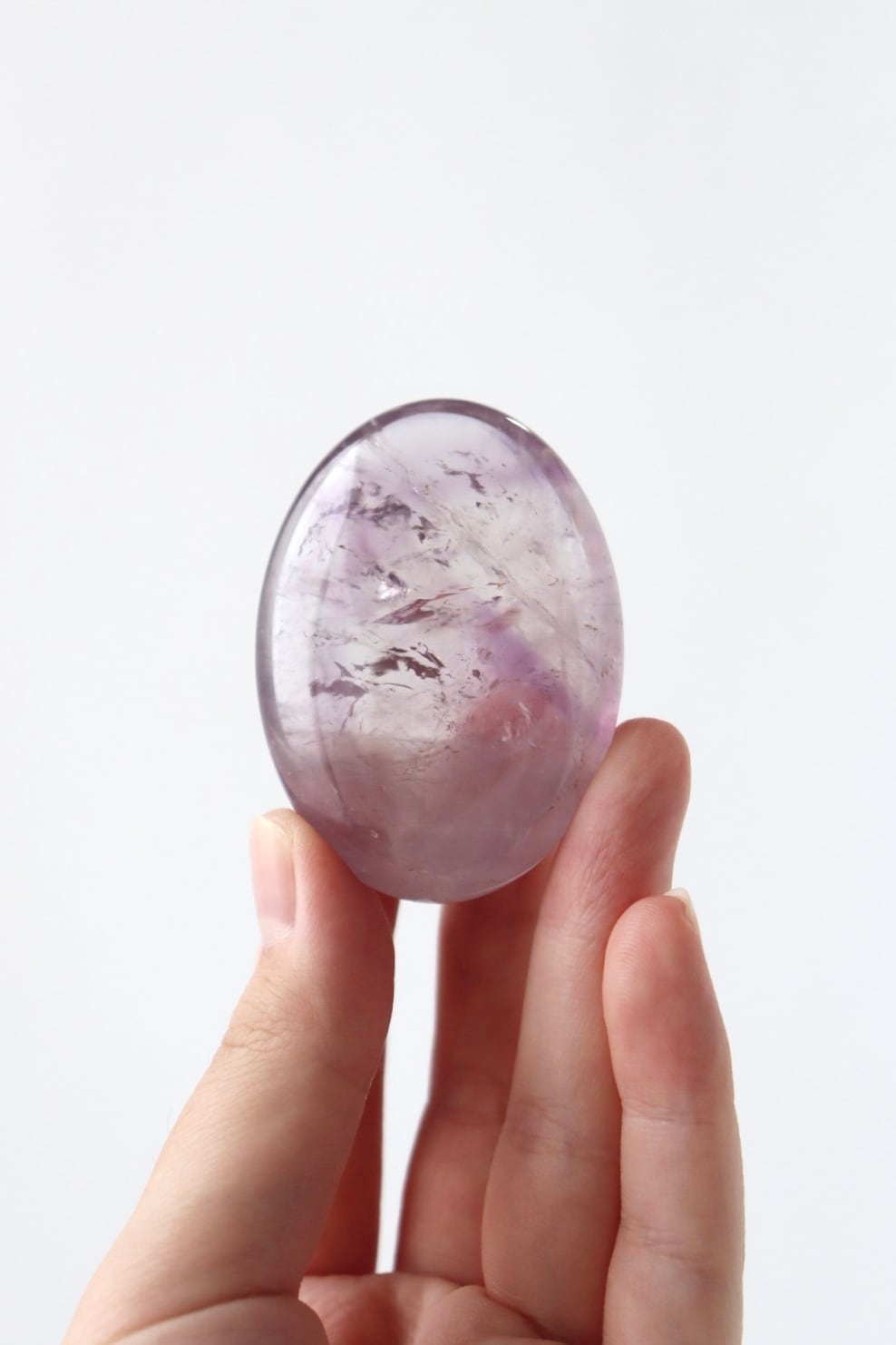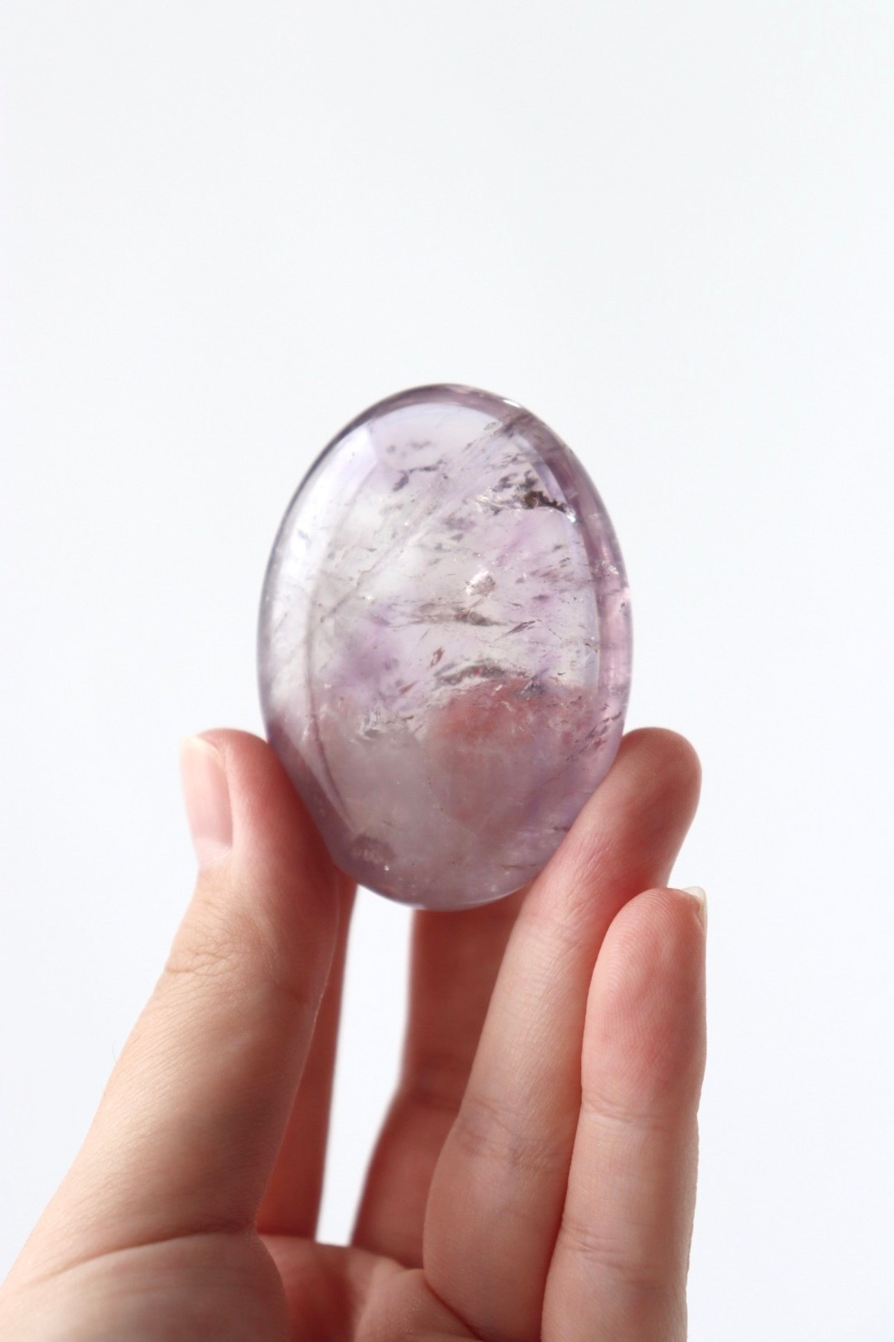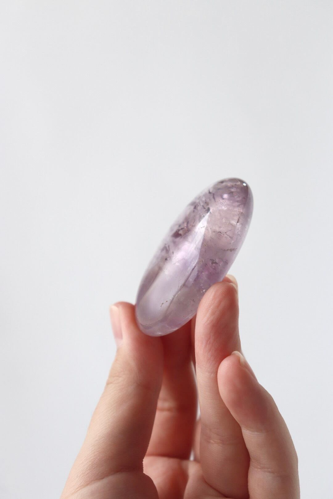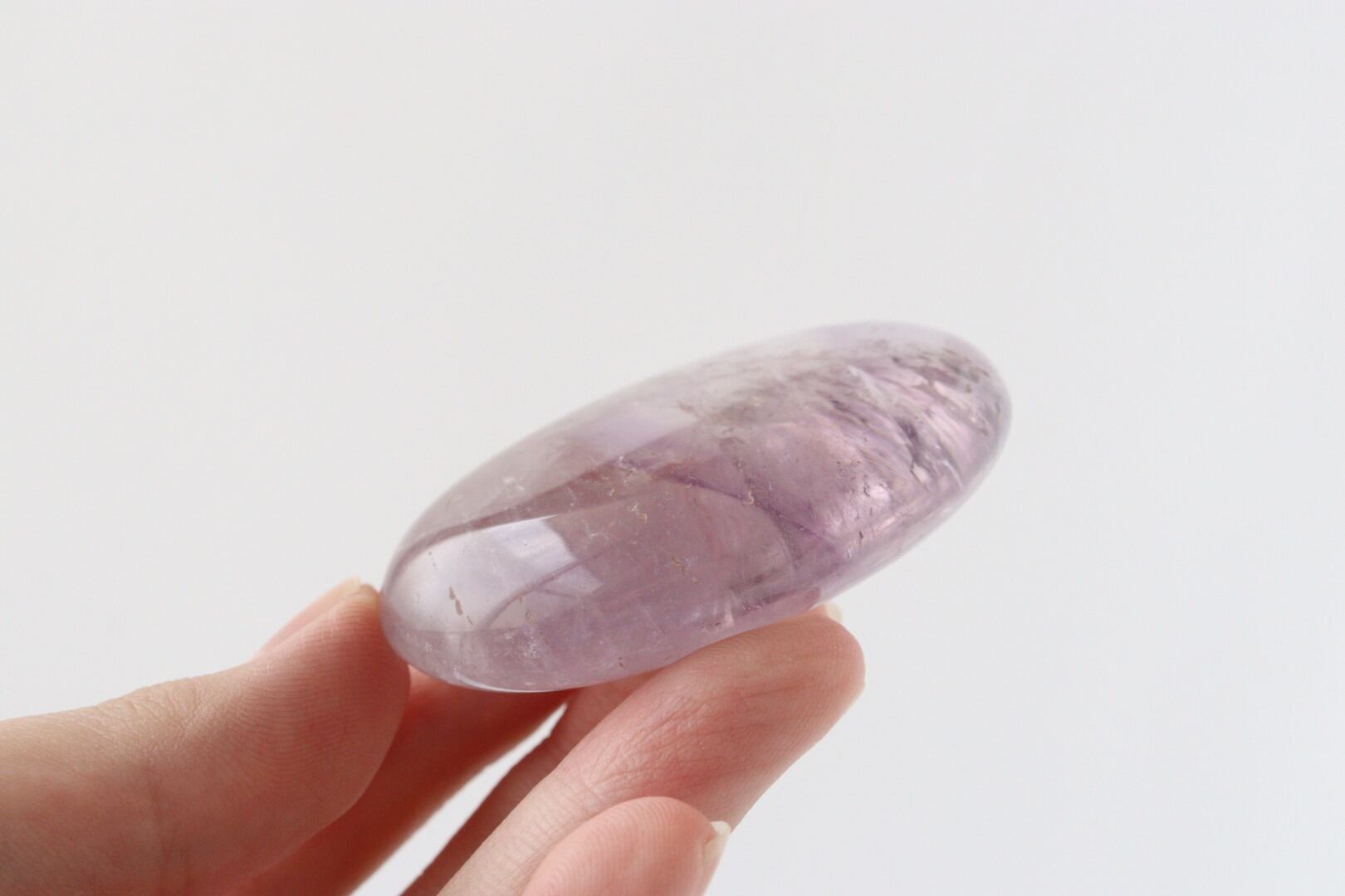 美しい握り石の形に磨かれた、透明感あふれるアメジスト。