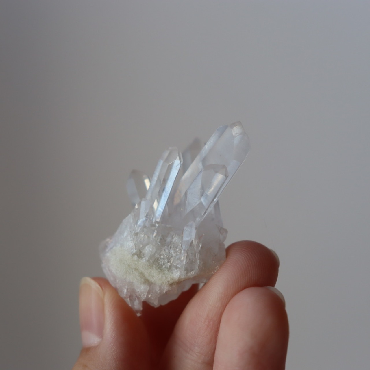 小さなクラスターながらも、自然の造形の妙と水晶の持つ清らかさをしっかりと感じられる原石です。デスクや窓辺などにそっと飾りたいピースです。