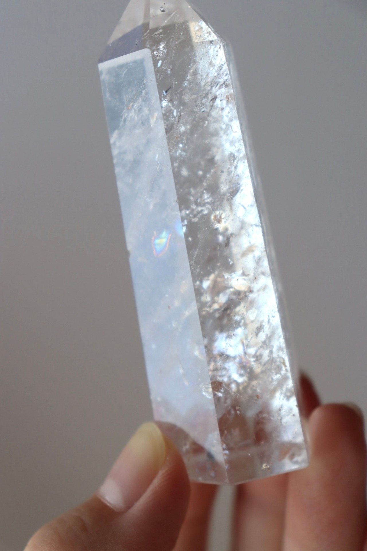 結晶の中を流れる光が虹を生み出し、見る角度によってあちこちで七色のきらめきが現れます。