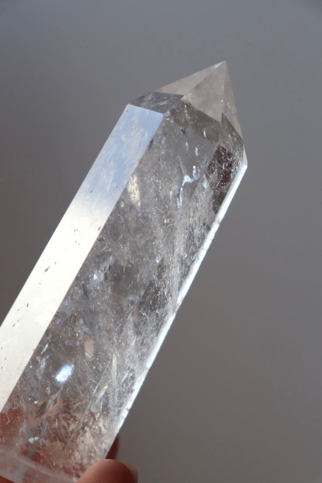 こちらは、内部に立ち上るような光のインクルージョンが美しく浮かび上がるクリアクォーツのタワー。