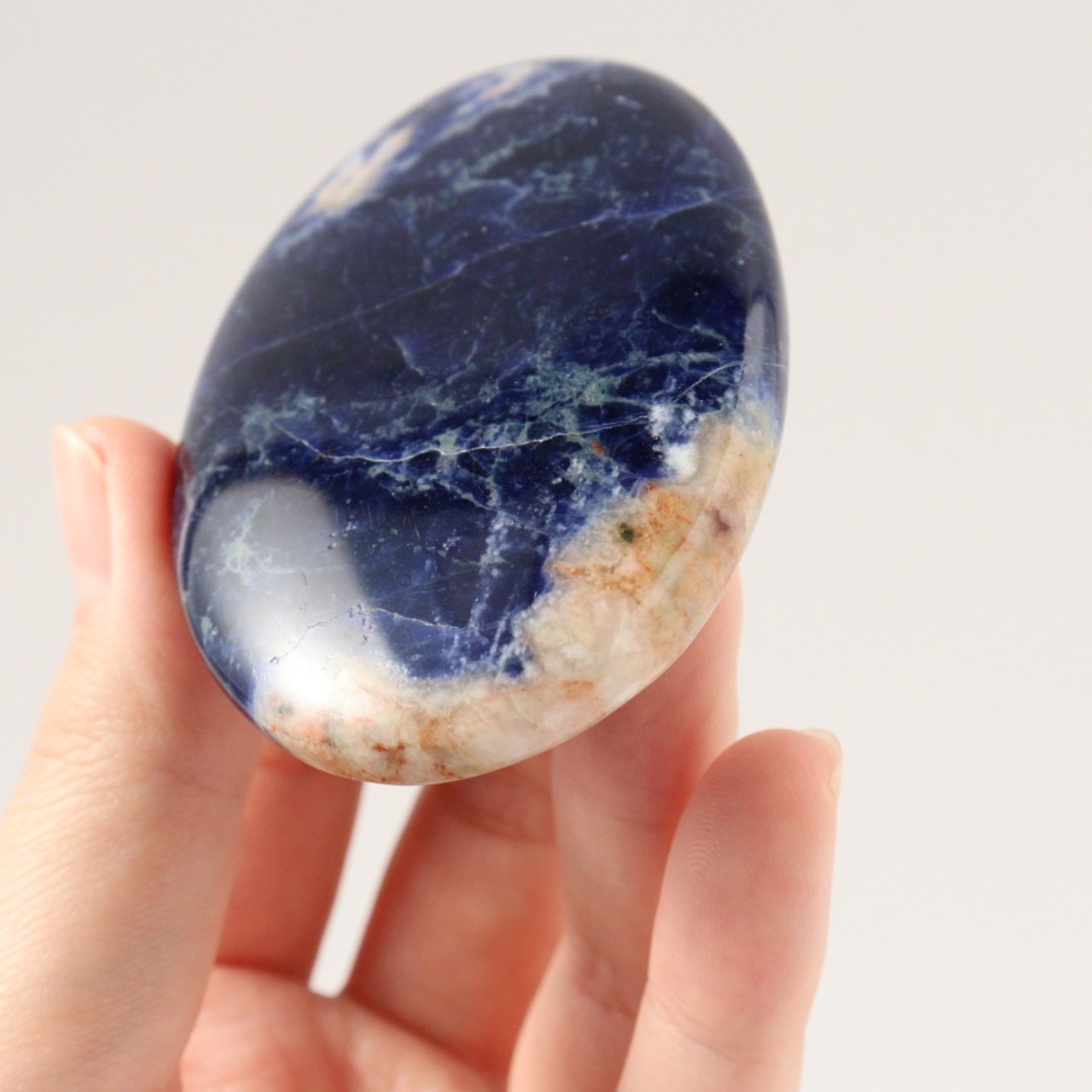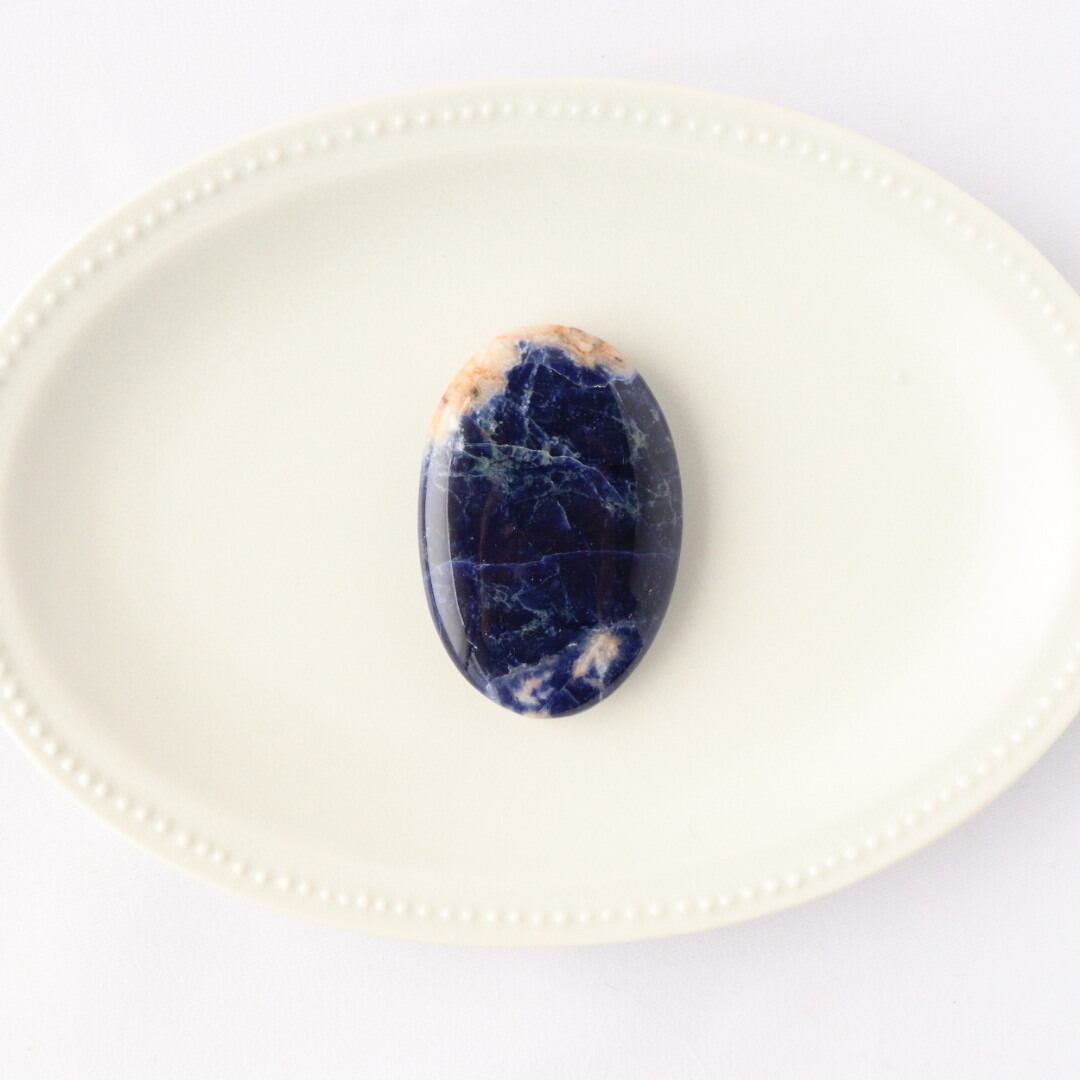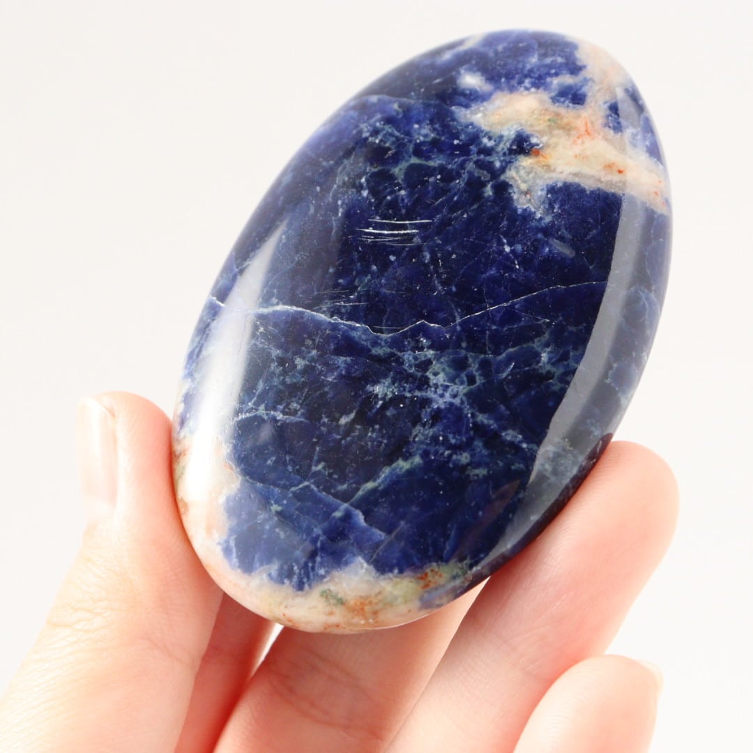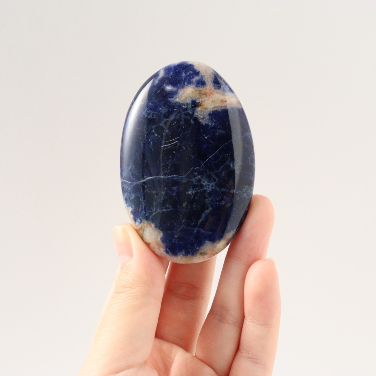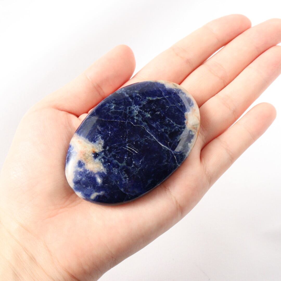 こちらは、深く濃いブルーに、自然なオフホワイトが柔らかく点在するソーダライトの握り石。